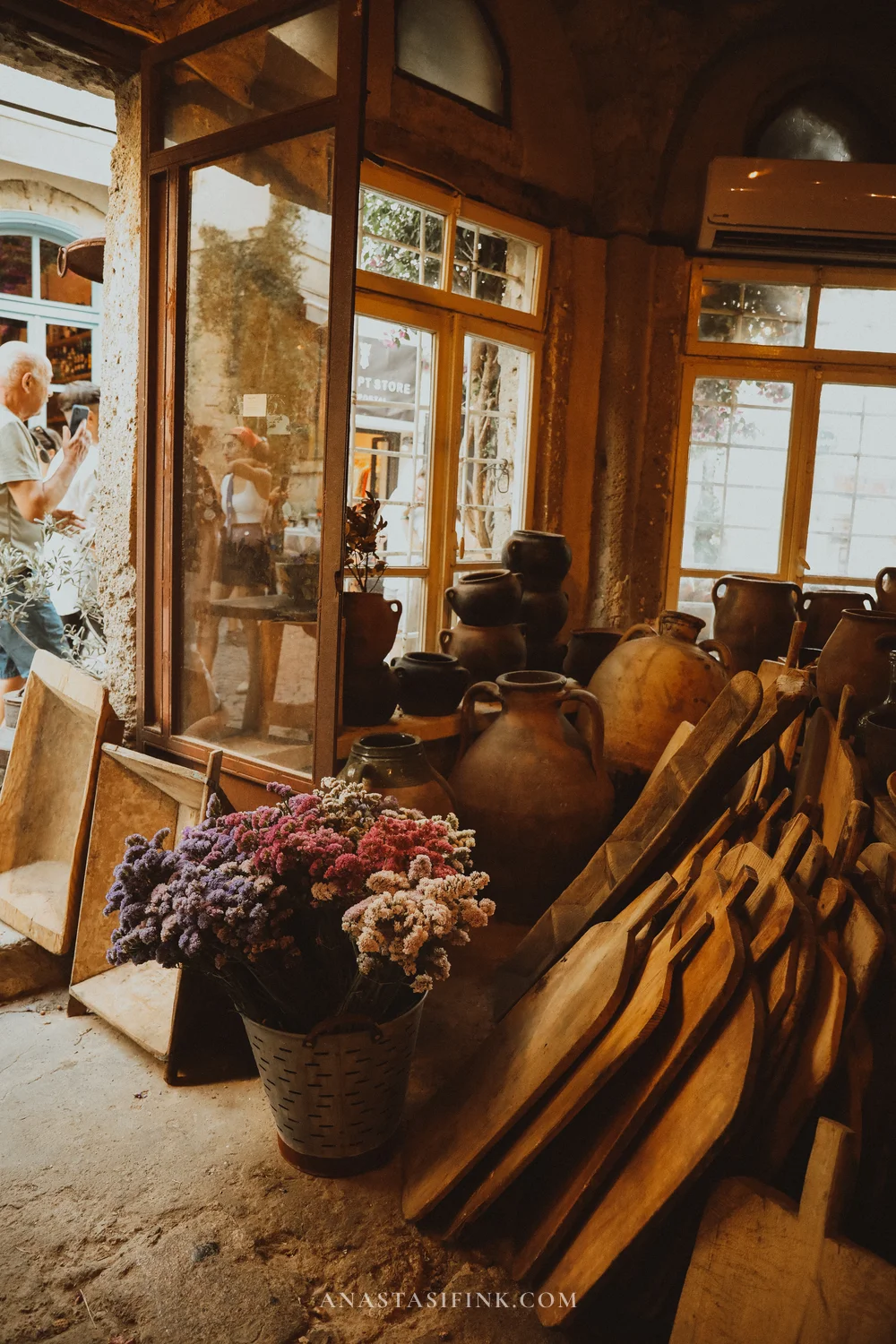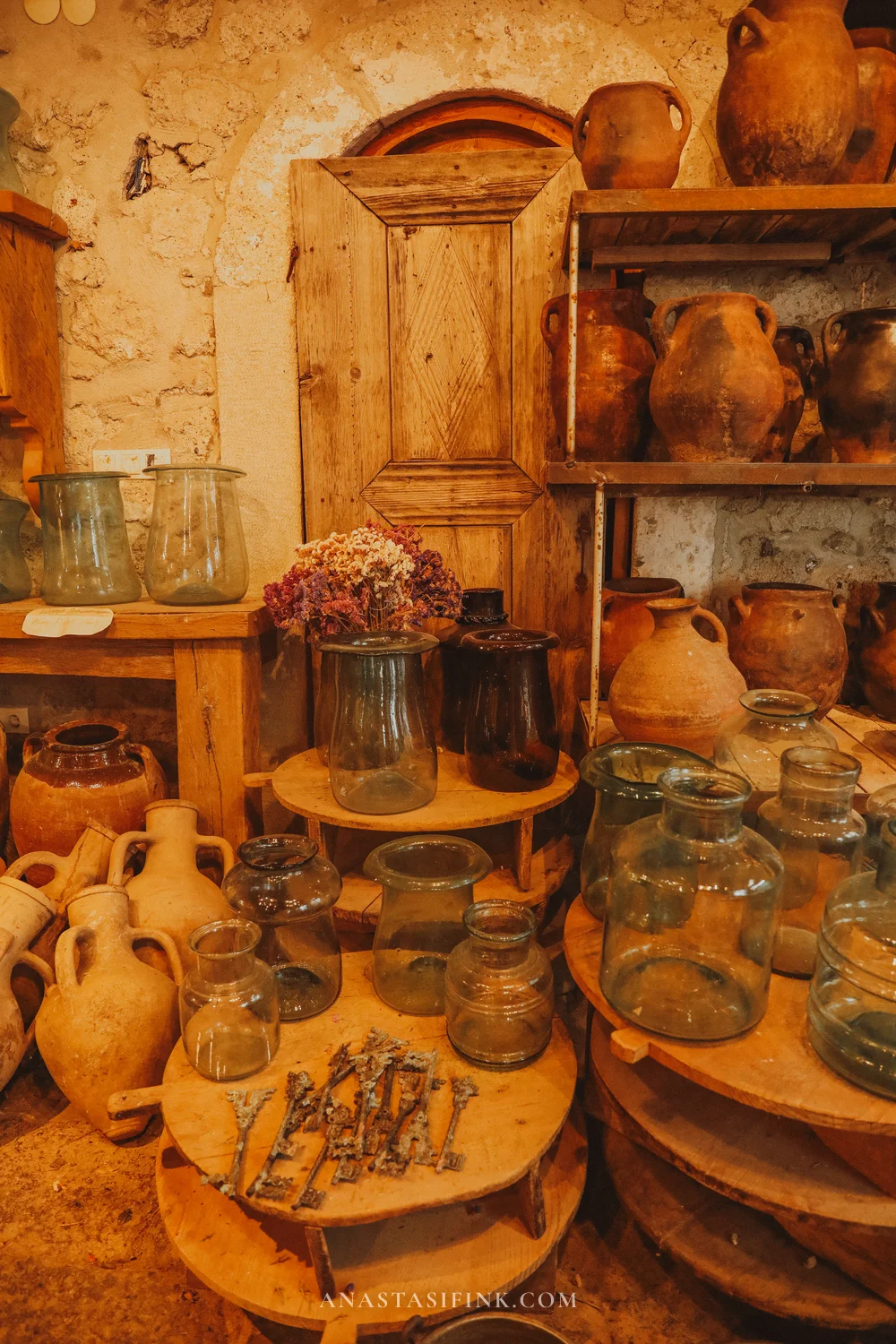Alaçatı has more antique shops than souvenir stores. Old clay jugs, glass jars, wooden boards, dried flowers — all for sale. In one shop, I found jugs that the owner claimed were over a hundred years old. Whether that’s true or not doesn’t matter — they look like something you’d want to take home.