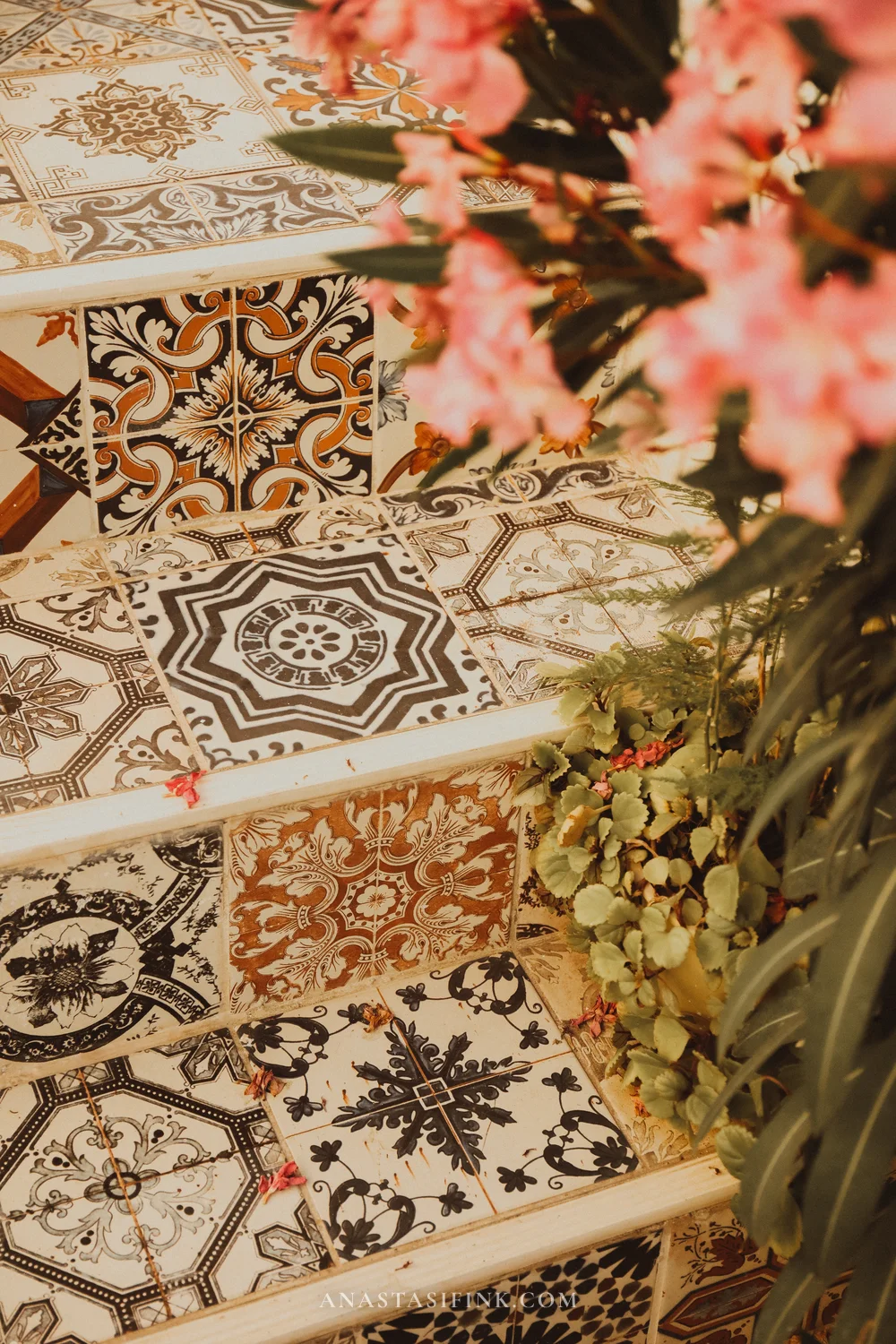 Tiles on the steps — each one with a different pattern. And archways hiding inner courtyards
