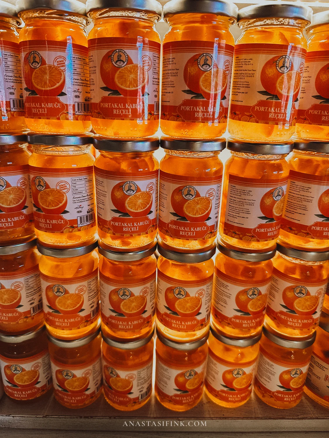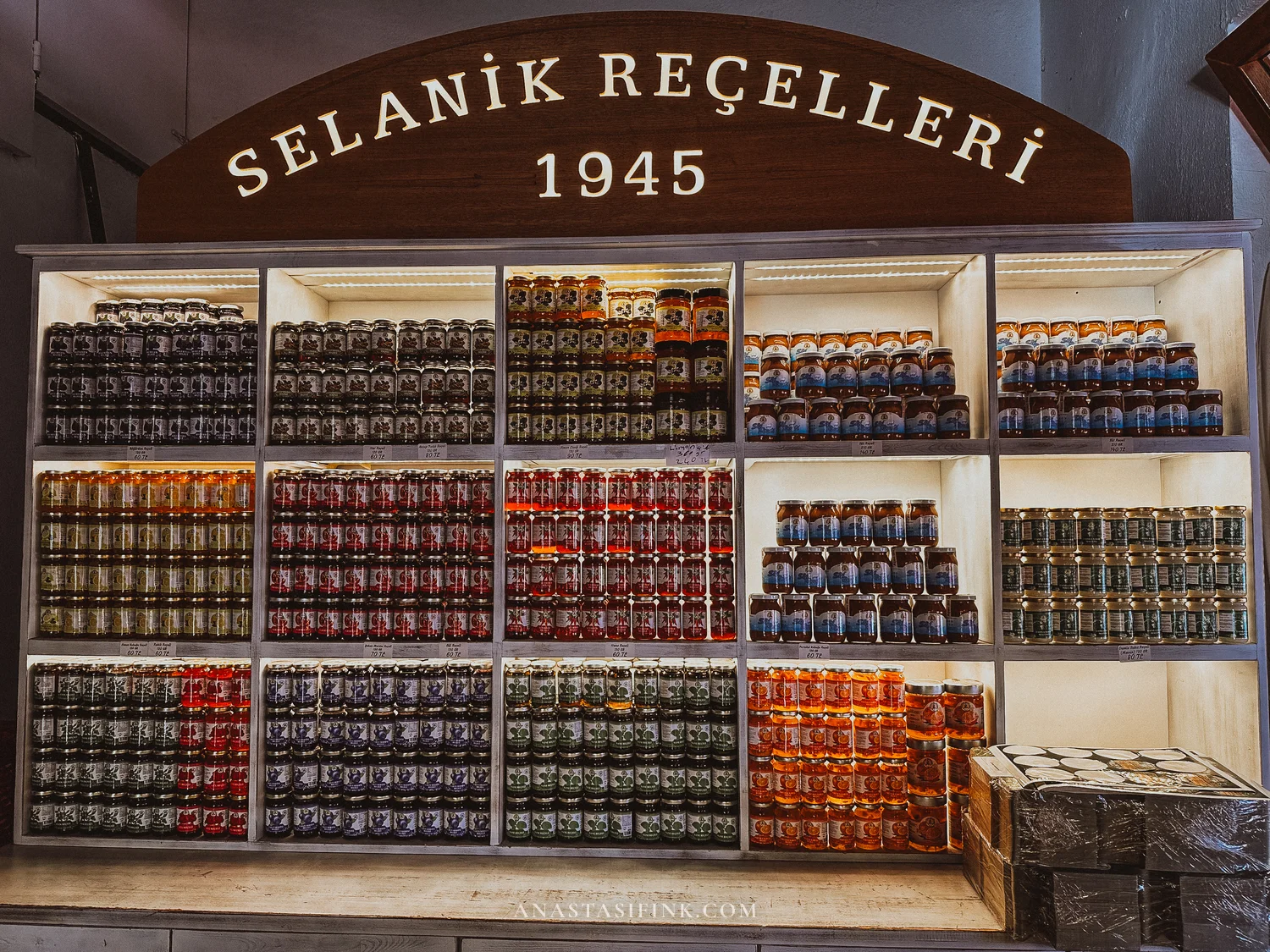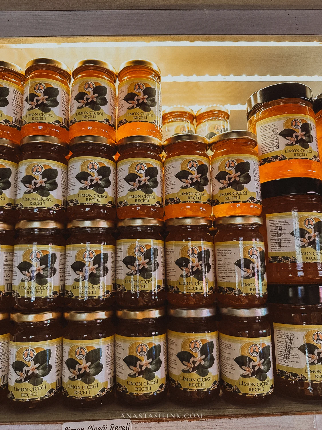 The shelves hold dozens of jam varieties: orange, lemon blossom (limon çiçeği reçeli), fig, rose petal. Cookies are sold by weight — crumbly, with mastic and almond.