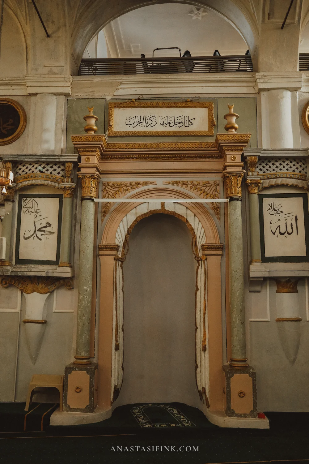 During restoration in 2009–2010, original icons and religious paintings were discovered beneath the plaster. Now, during prayer time they are covered with a curtain, but the rest of the time you can see both the mihrab and the surviving Greek art. A three-nave basilica with arched columns — icons and a mihrab under one roof.