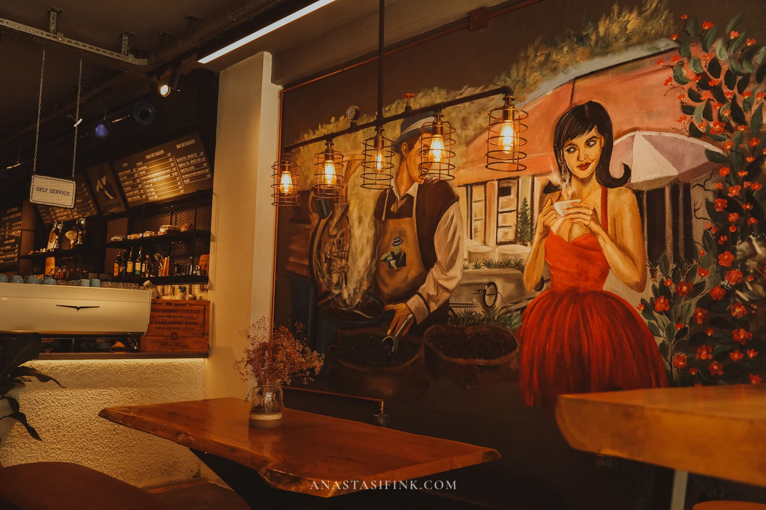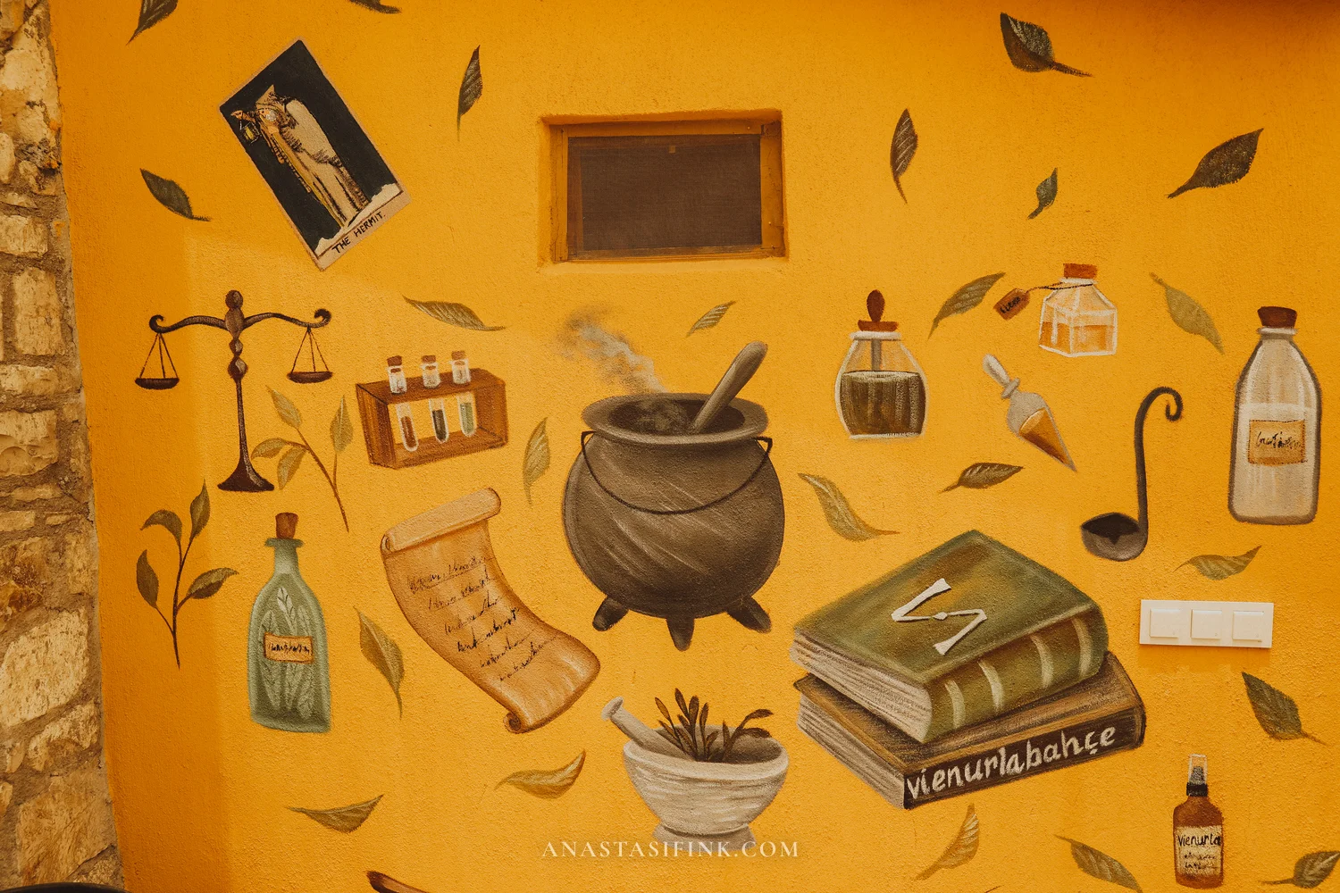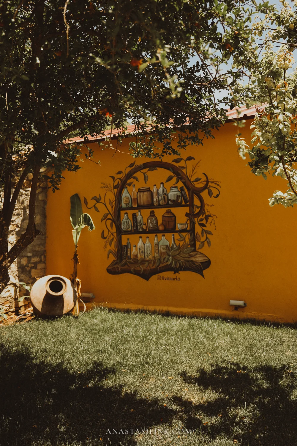 On one of the streets, a bright yellow wall is painted with a medieval apothecary scene: a cauldron, scales, bottles of herbs, books. This is VienUrlaBahçe — you can spot the yellow walls from far away.