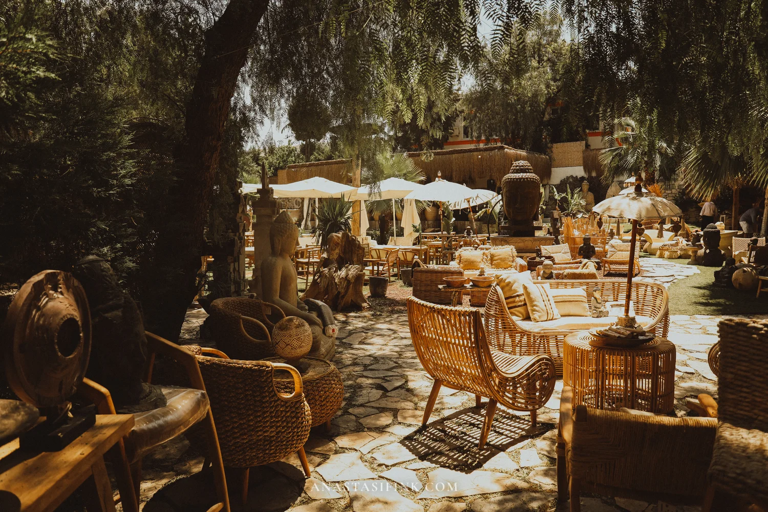 The courtyard has even more furniture, arranged like an interior design catalog. Rattan chairs, ethnic cushions, parasols.