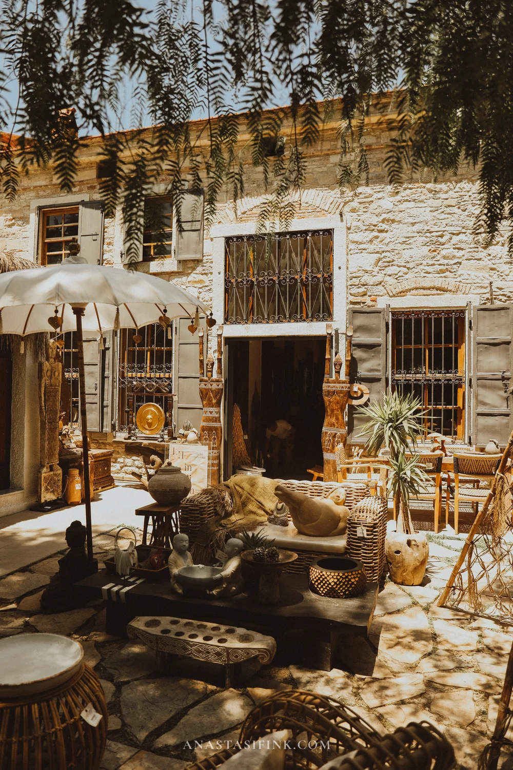 Ekrou Boutique is a shop on Uzun Street (Uzun Sk. No:4) that deserves its own visit. Inside — a long corridor of an old stone building filled with things brought from Bali and Southeast Asia: rattan chairs, wooden sculptures, carved lanterns, handwoven textiles.