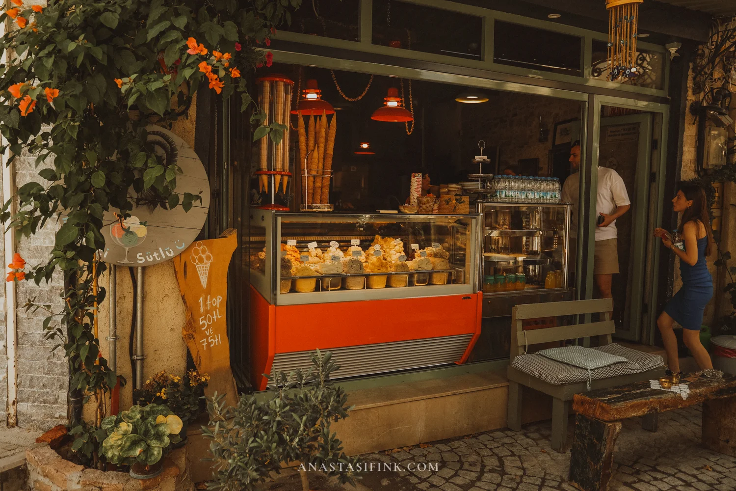You have to try ice cream in Urla. Necco Dondurma (owner — Necati Karakoç) is a small shop with an orange display case and handwritten price tags. Sakızlı (with mastic tree resin), “Yasak Mevsim,” and other flavors you won’t find in chain cafés.