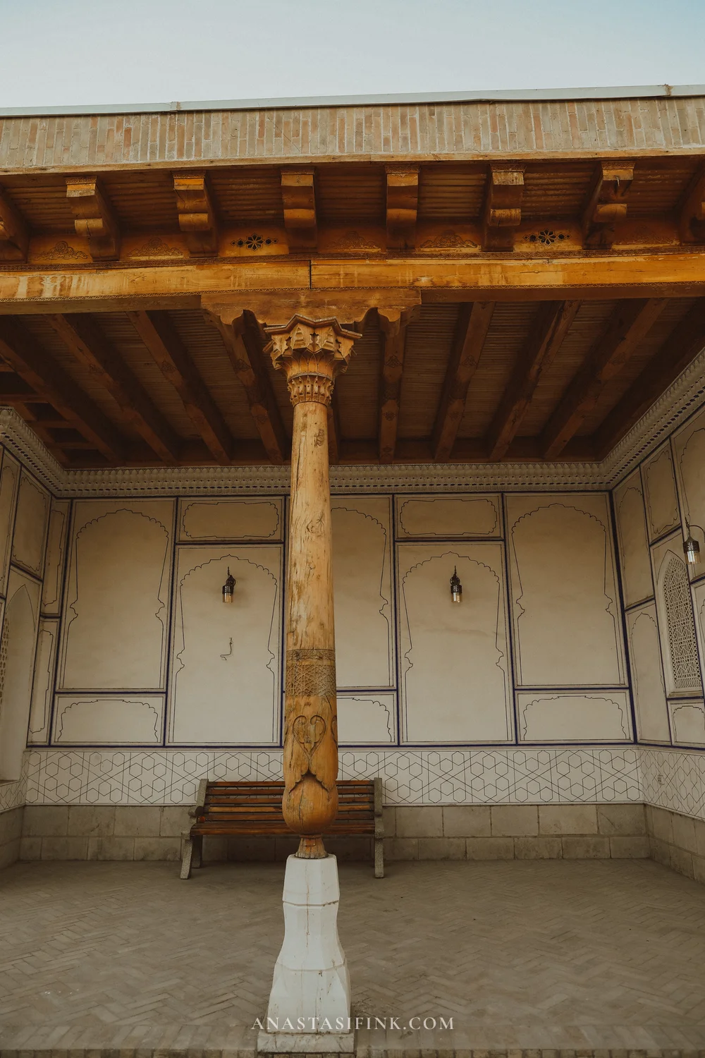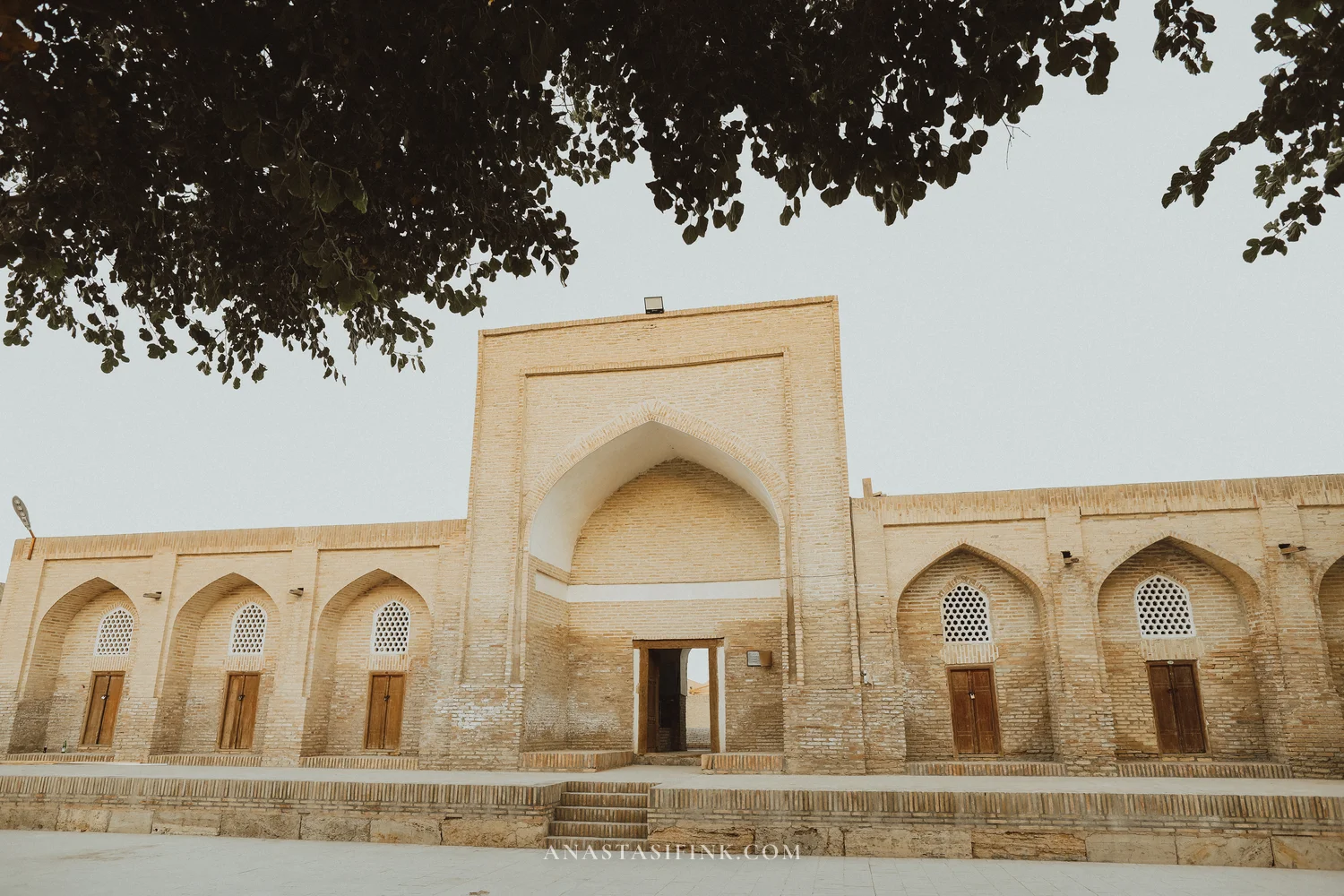 This round brick minaret is a scaled-down copy of the famous Kalyan Minaret in Bukhara itself. It’s about 18 metres tall, with a spiral staircase inside (closed to visitors). From the right angle, the minaret, the madrasah and the khanaqah dome line up into a classic Bukhara photo — but without the crowds at Poi-Kalyan.