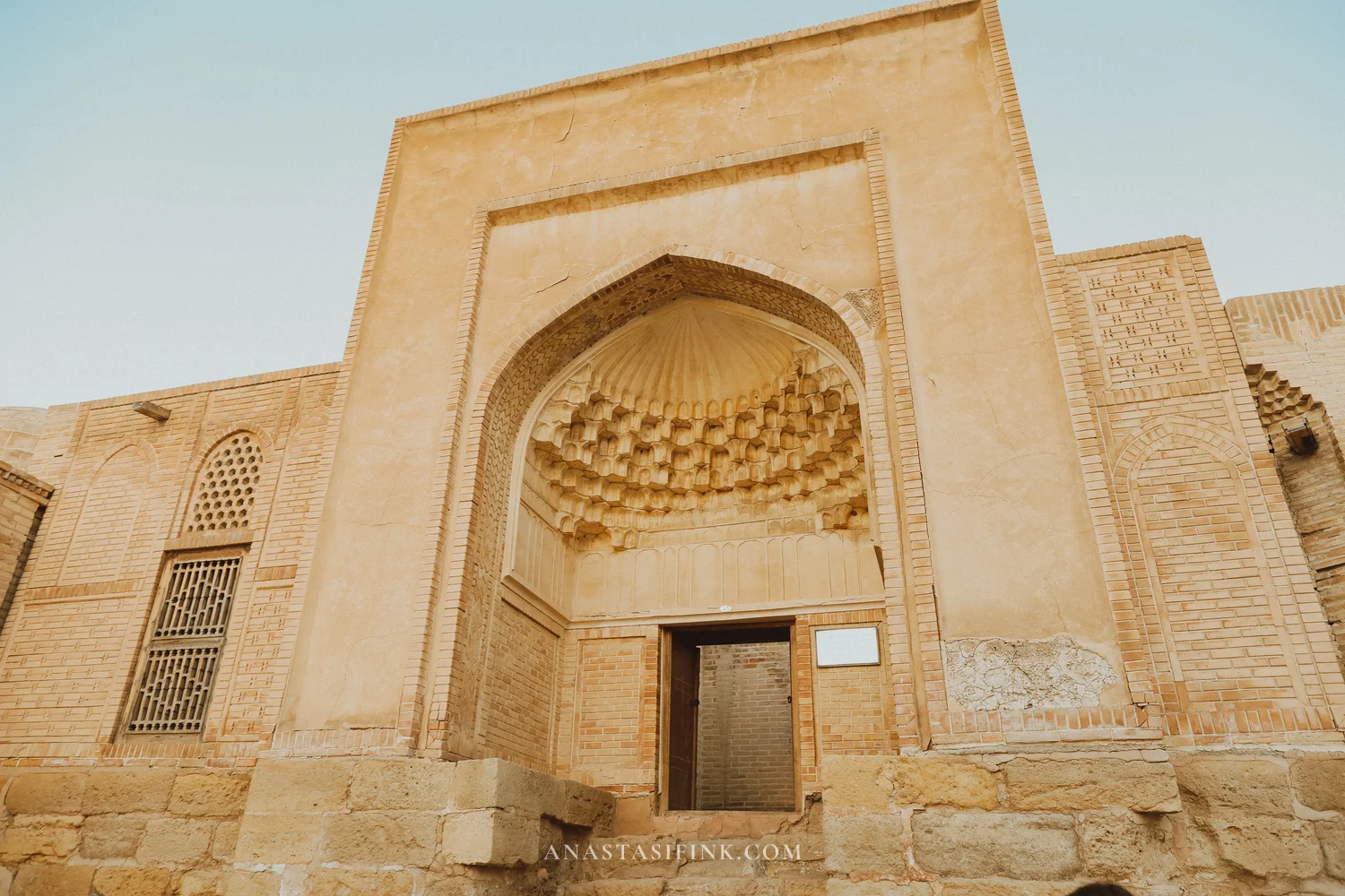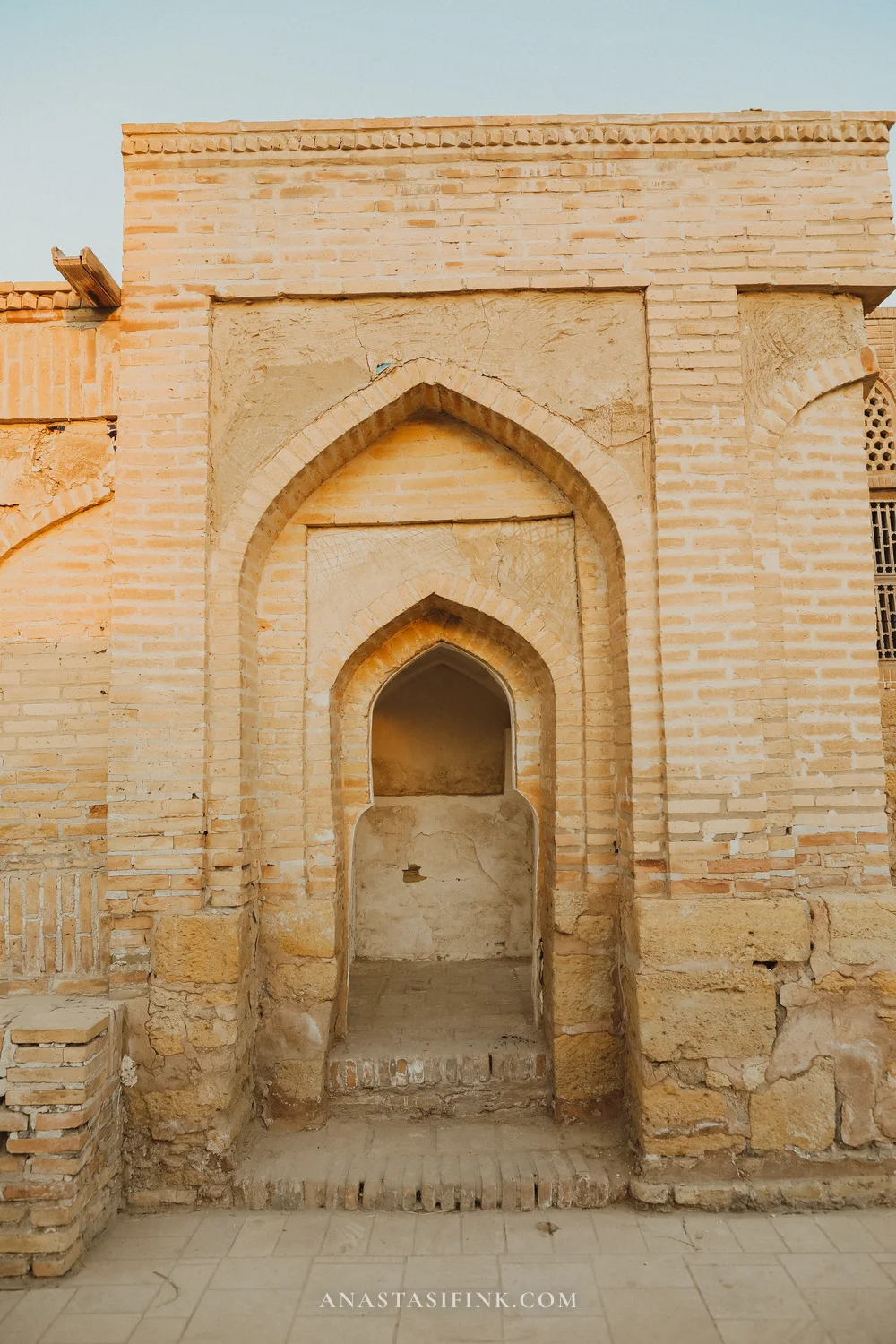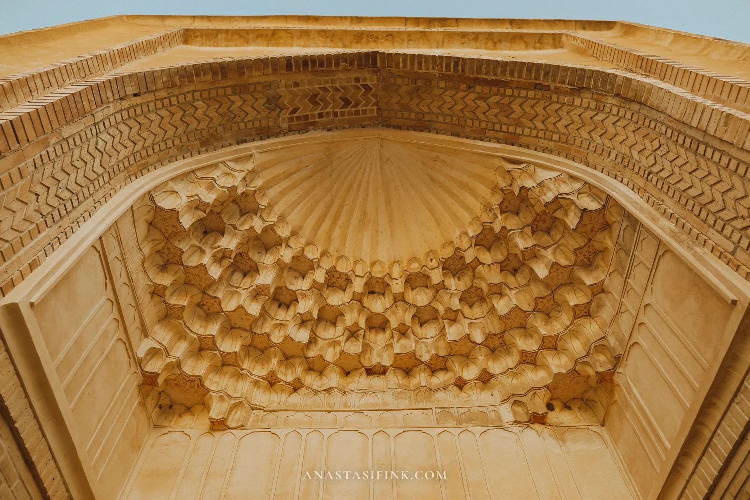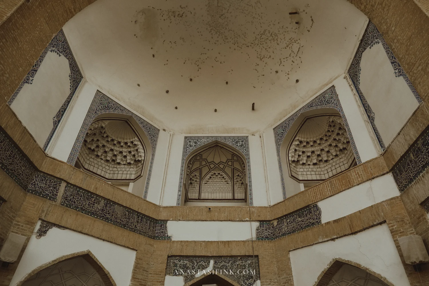 Chor-Bakr rewards slow walking and looking up. Every khazira portal is its own architectural puzzle: in some, the muqarnas are tightly packed into a strict honeycomb; in others, a mosaic band with Kufic script runs along the edge; in others again, it’s just a plain brick iwan with no decoration but perfect proportions. Much of the original tilework is lost and hasn’t been restored — and that, perhaps, is the most valuable part: what you’re looking at isn’t a museum reconstruction, it’s living 16th-century architecture wearing four centuries of patina.