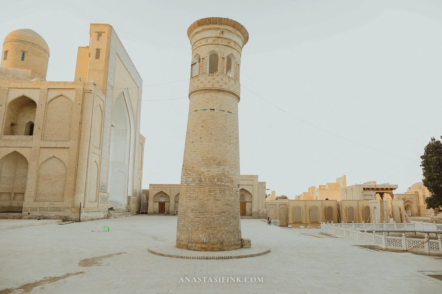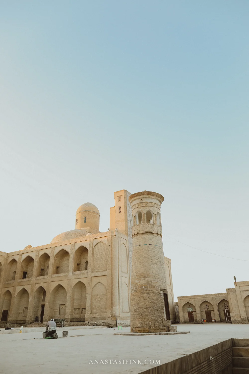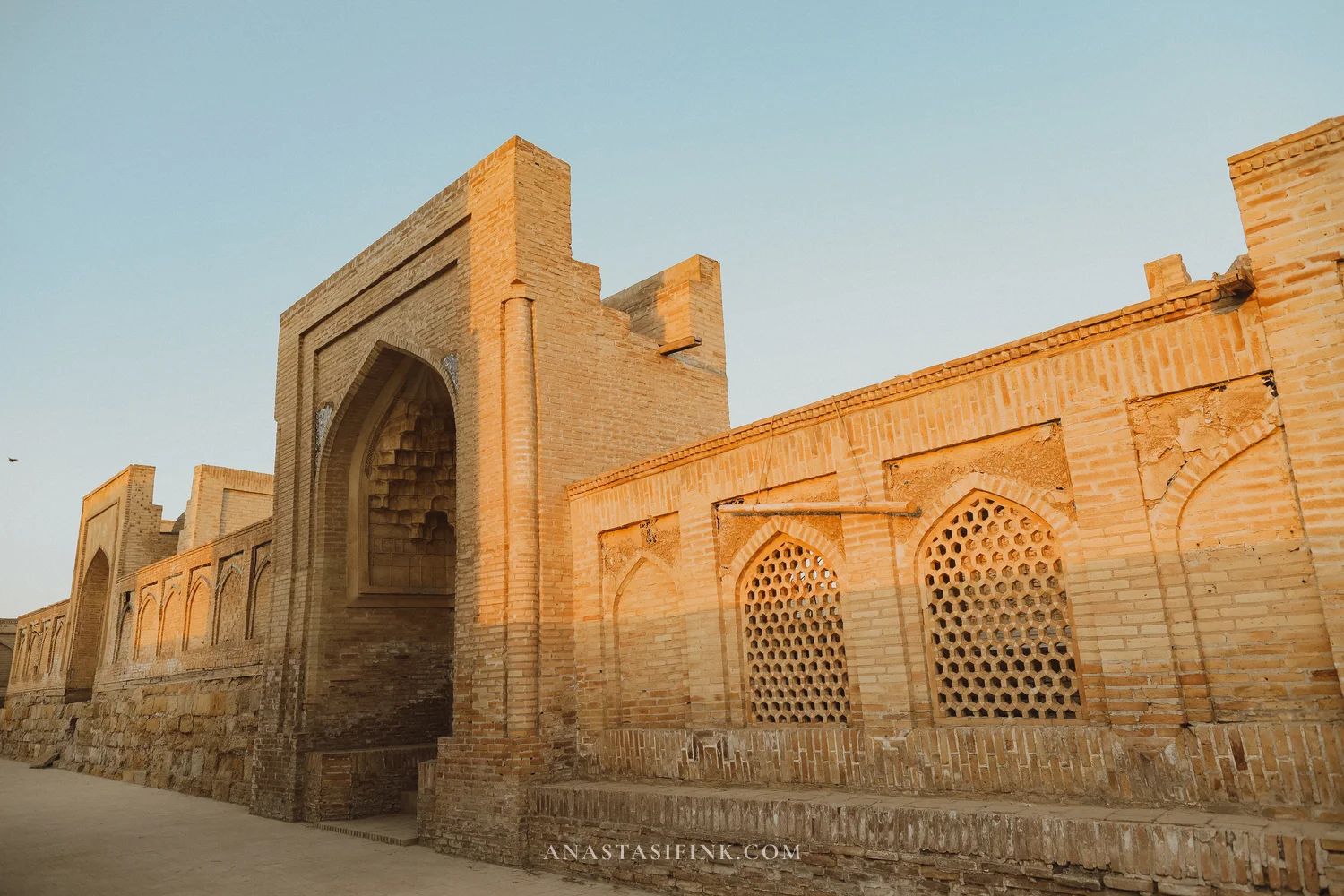 The best time is 1.5–2 hours before sunset. The light is golden, the shadows are deep, and there are almost no visitors (most tour groups come in the morning). Sunrise also works well, especially if you want crowd-free shots — the turquoise dome of old Bukhara on the horizon glows in the early light. Midday is the worst time: harsh shadows and heat.