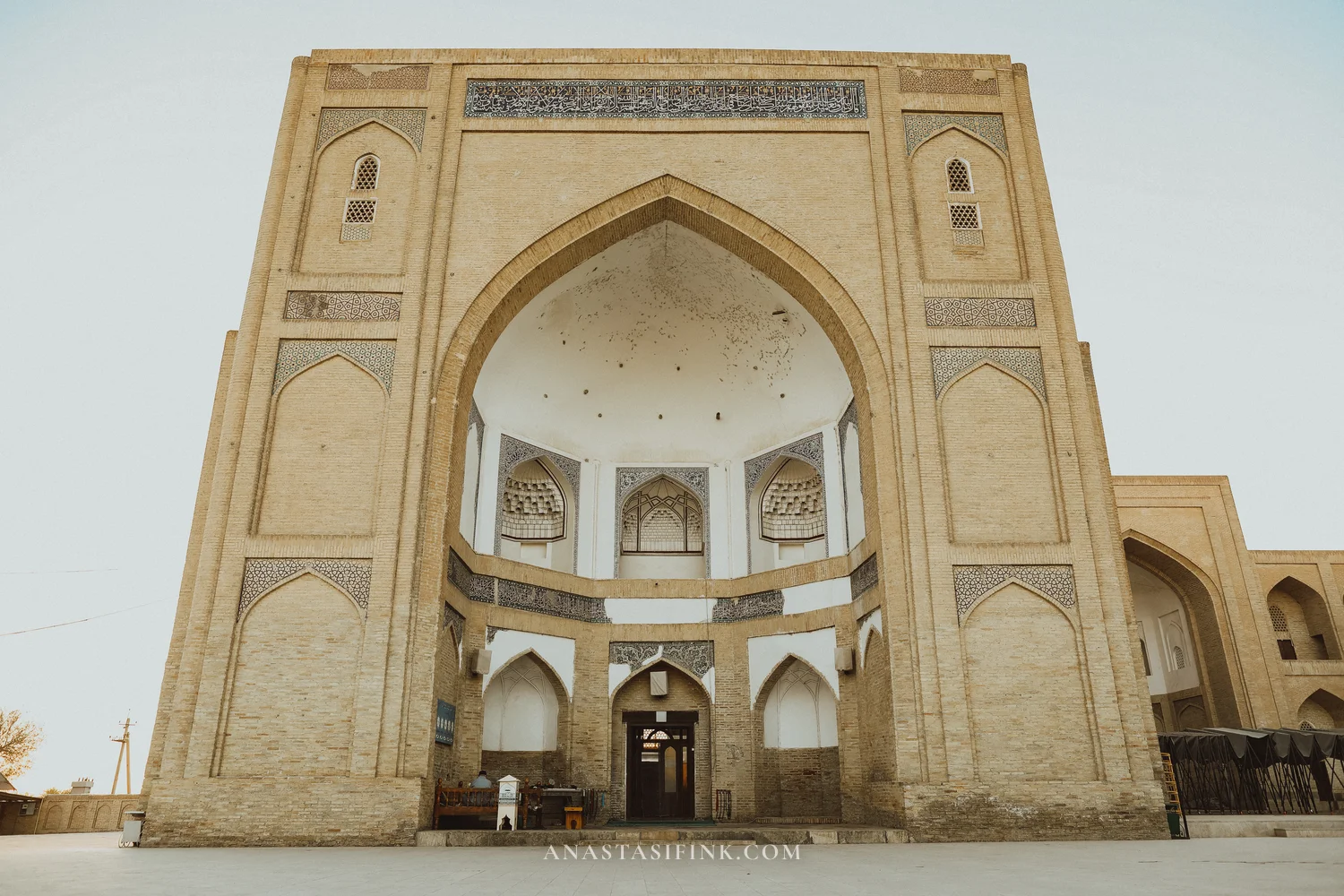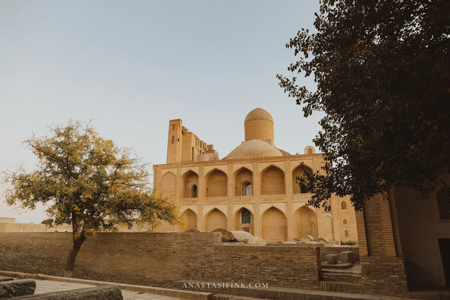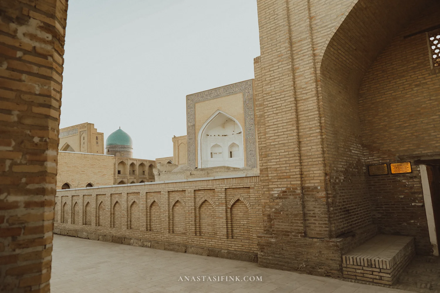 The best time is 1.5–2 hours before sunset. The light is golden, the shadows are deep, and there are almost no visitors (most tour groups come in the morning). Sunrise also works well, especially if you want crowd-free shots — the turquoise dome of old Bukhara on the horizon glows in the early light. Midday is the worst time: harsh shadows and heat.