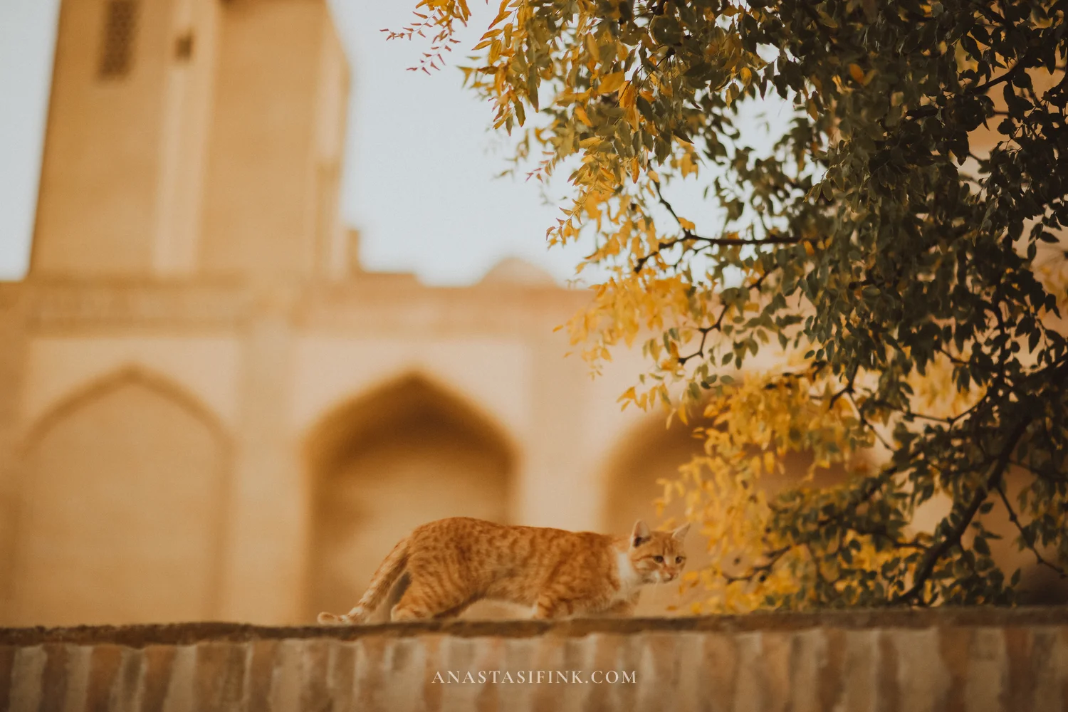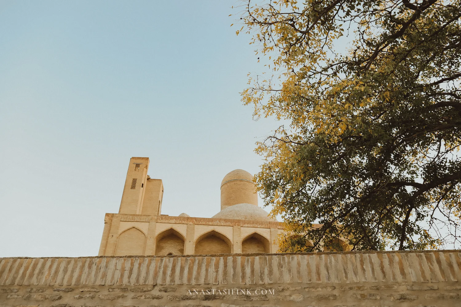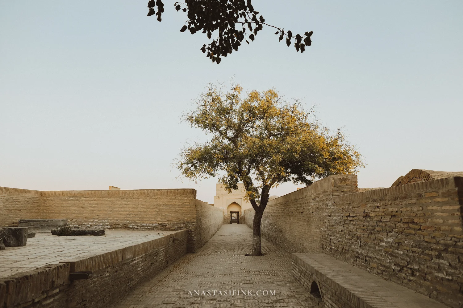 I came in October, and Chor-Bakr caught me in autumn: yellow leaves on the plane trees, warm honey-coloured brick, low sunlight. It’s not the most famous place in Bukhara, but at this time of year it’s one of the most photogenic. Vertical tree trunks against portals, foliage close-ups, a cat on a wall — the shots assemble themselves.