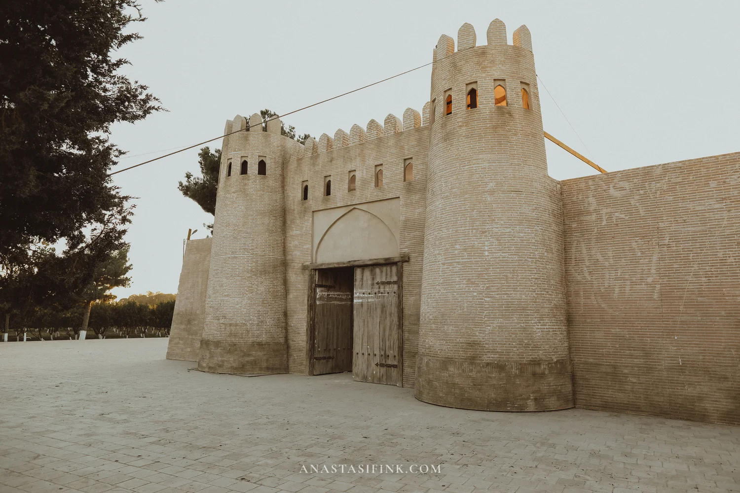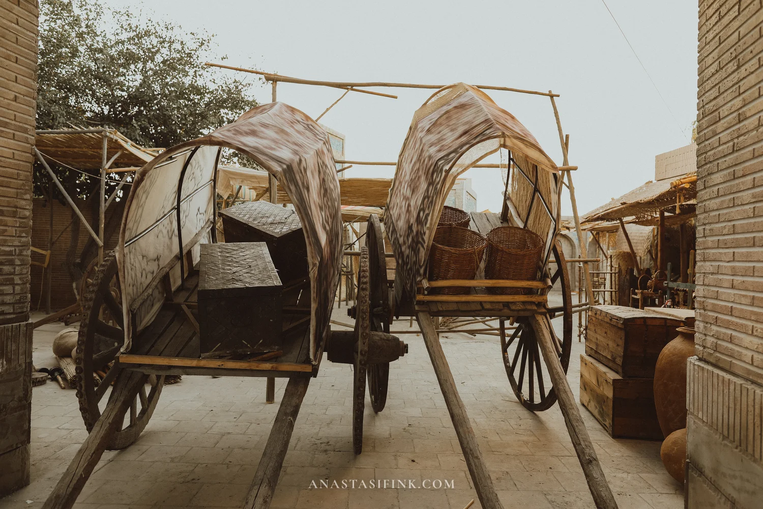 They’re props left over from a historical film shoot — fortress-style gates with towers and old ox-carts under canvas. Chor-Bakr is sometimes used as a film location for Central Asian historical dramas, and not all of the sets get dismantled. They’re set apart from the main complex, so you can easily skip them if you only care about the genuine 16th-century buildings.
