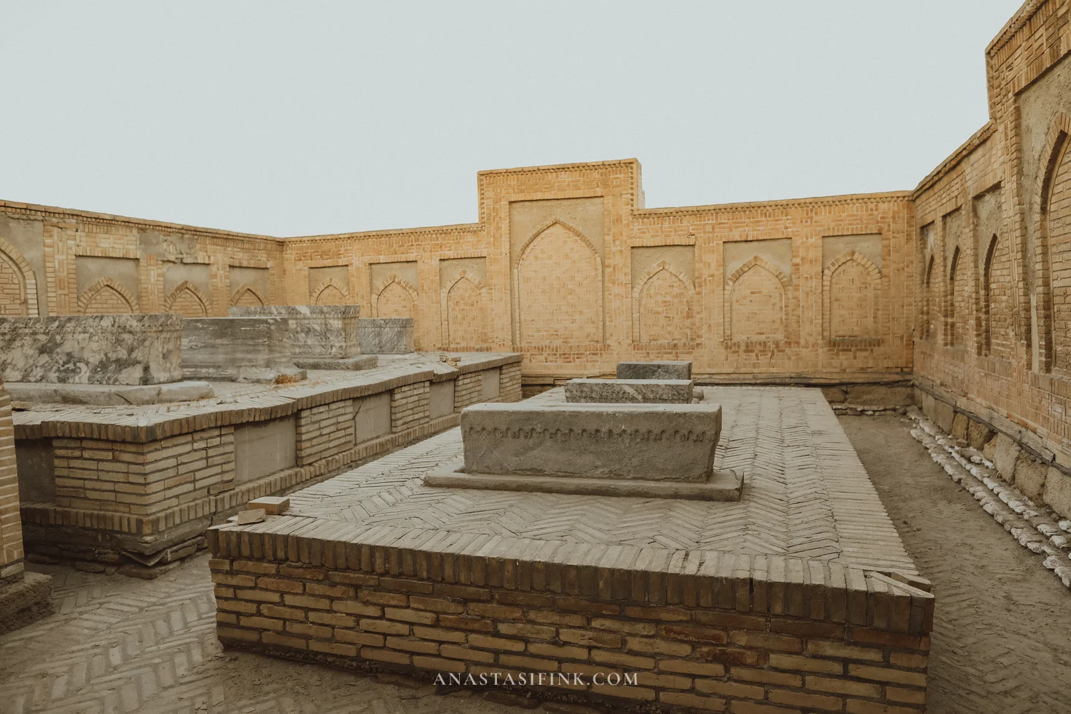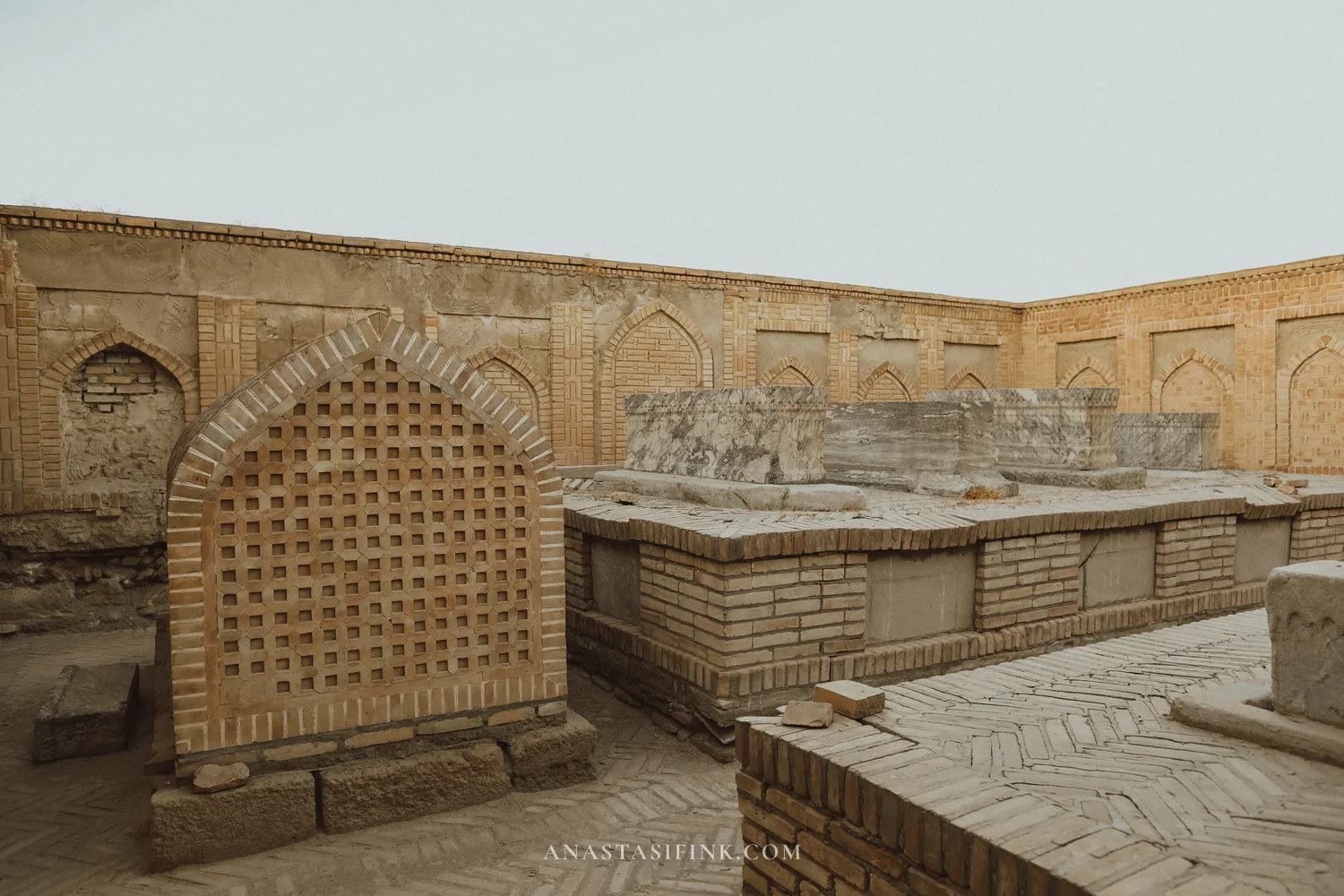 Beyond the main ensemble, the heart of Chor-Bakr is the necropolis itself. It’s a maze of streets and courtyards, with khazira — walled family burial enclosures with no roof — scattered throughout. Inside the khaziras, stone sarcophagi sit either in rows or one by one. The paths are paved with herringbone brick and twist between buildings so unpredictably that you’ll need a map to keep your bearings.