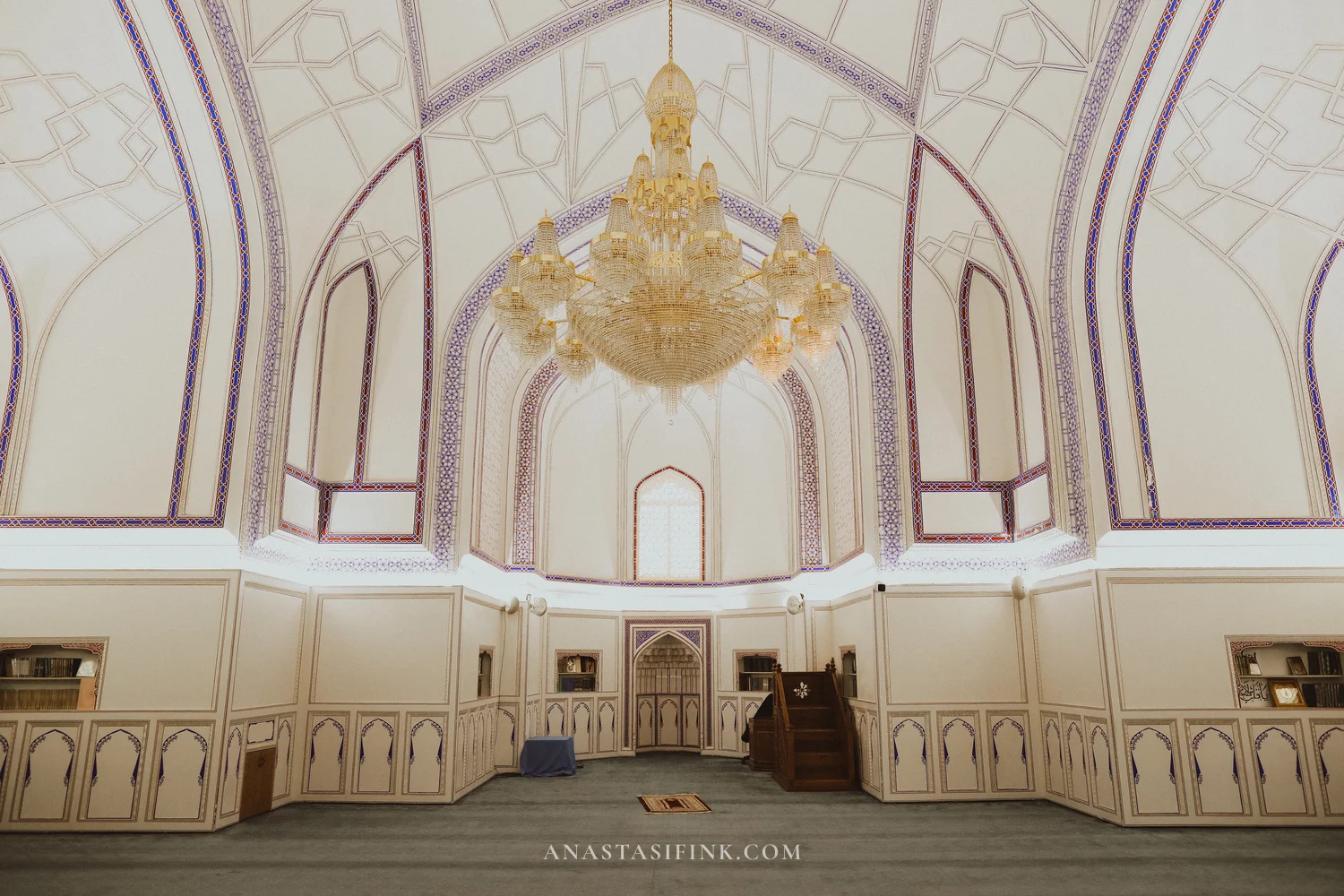 The khanaqah preserves a huge octagonal hall with a honeycombed muqarnas dome. The plaster has come off in places, the walls are blotchy — but it’s exactly this rough state that makes the hall feel alive, not museum-perfect. The mosque is the opposite: fully restored, with white walls, fine ornamental painting in burgundy and grey, a huge gilt chandelier. The mosque is active — people come to pray here on Fridays.