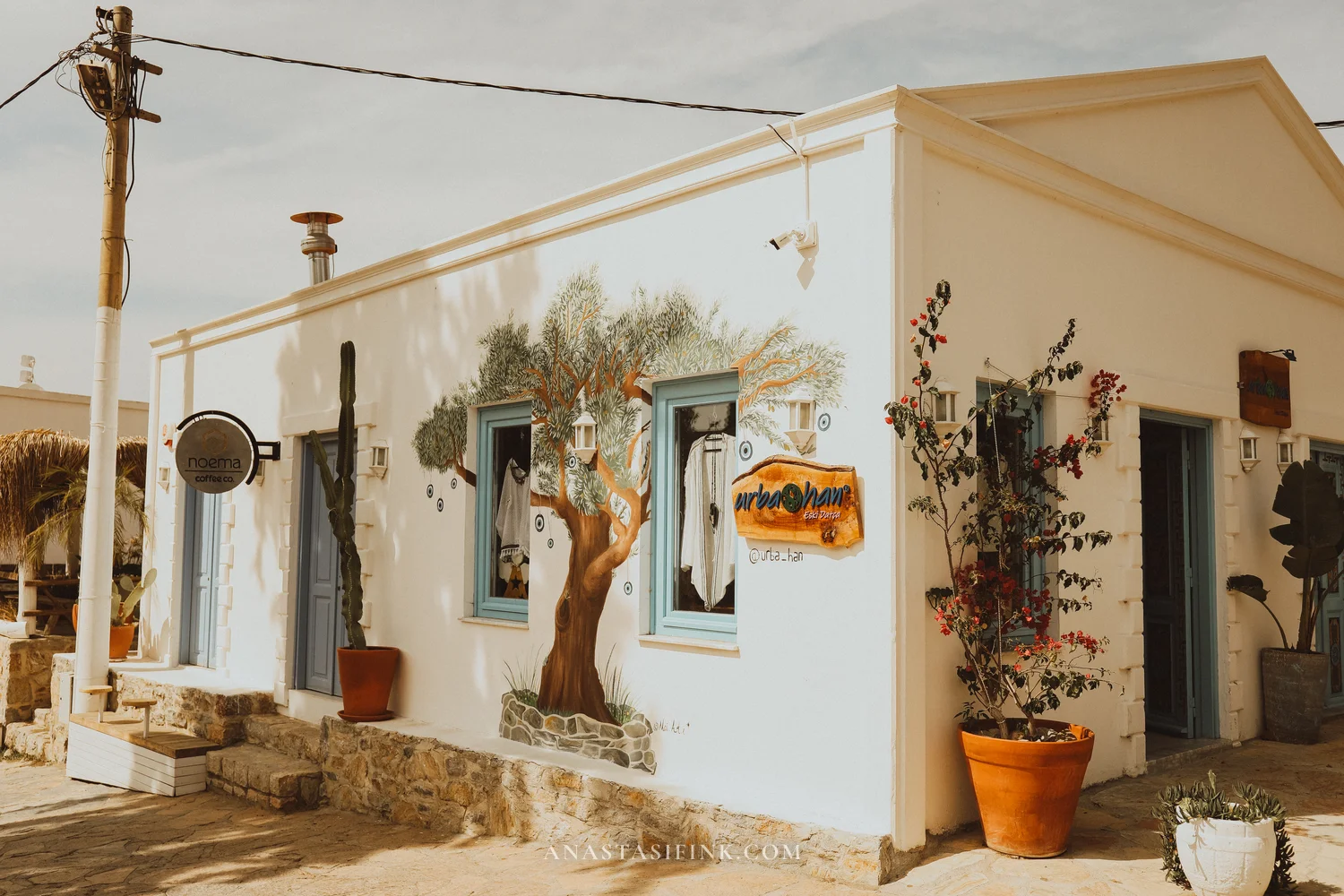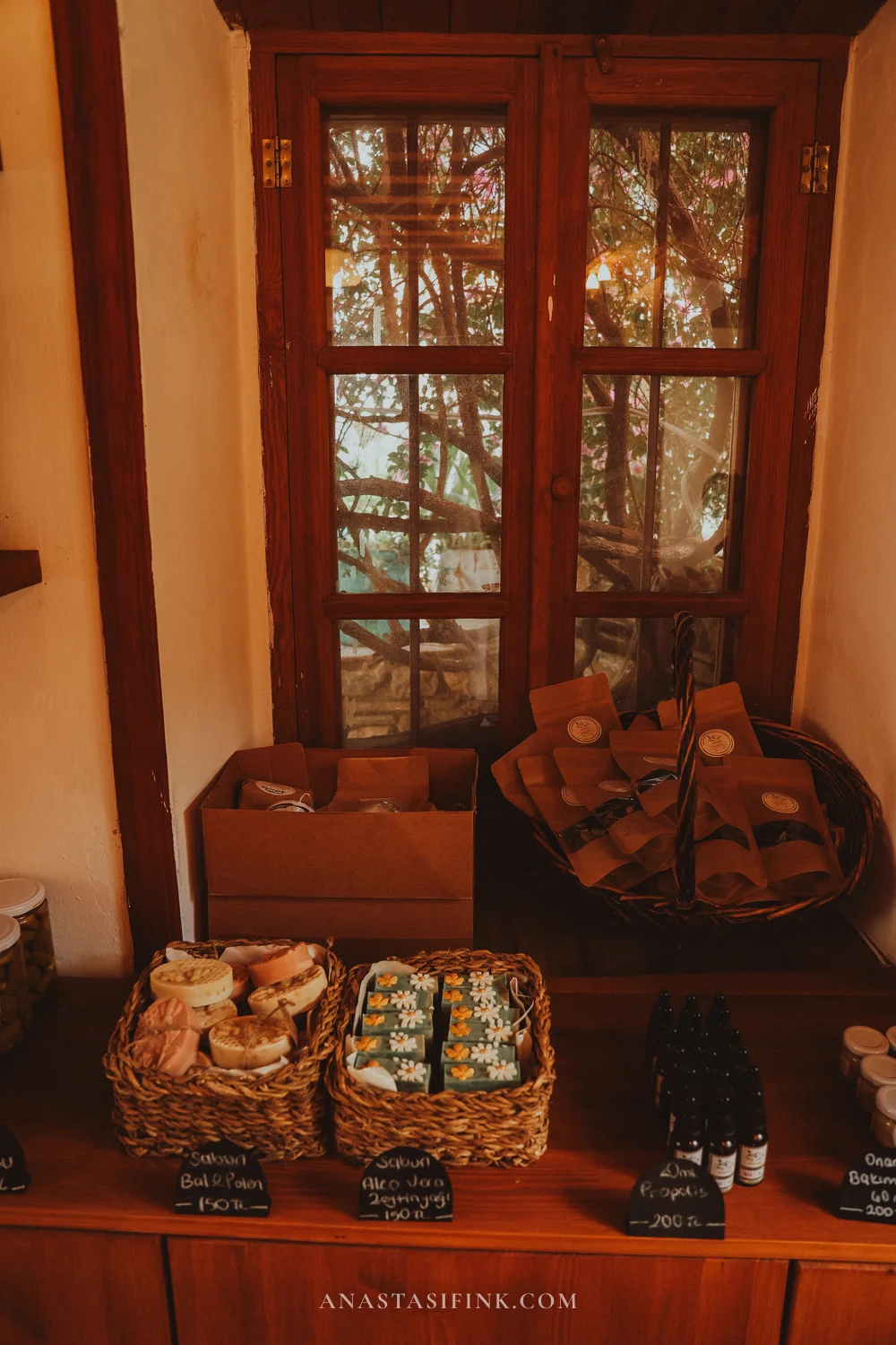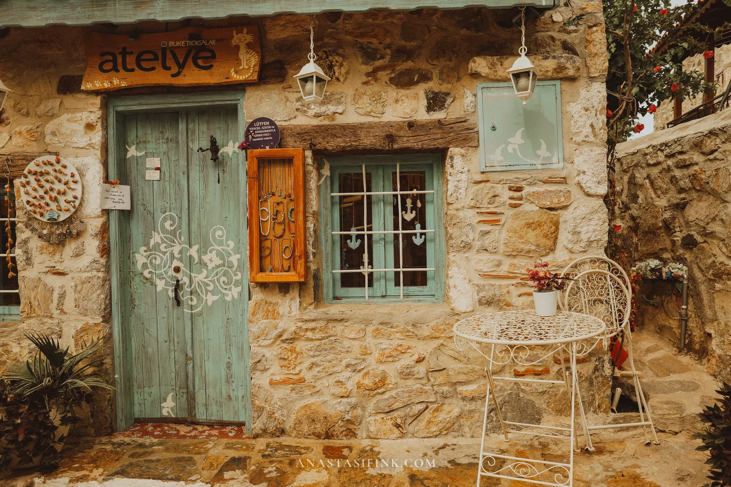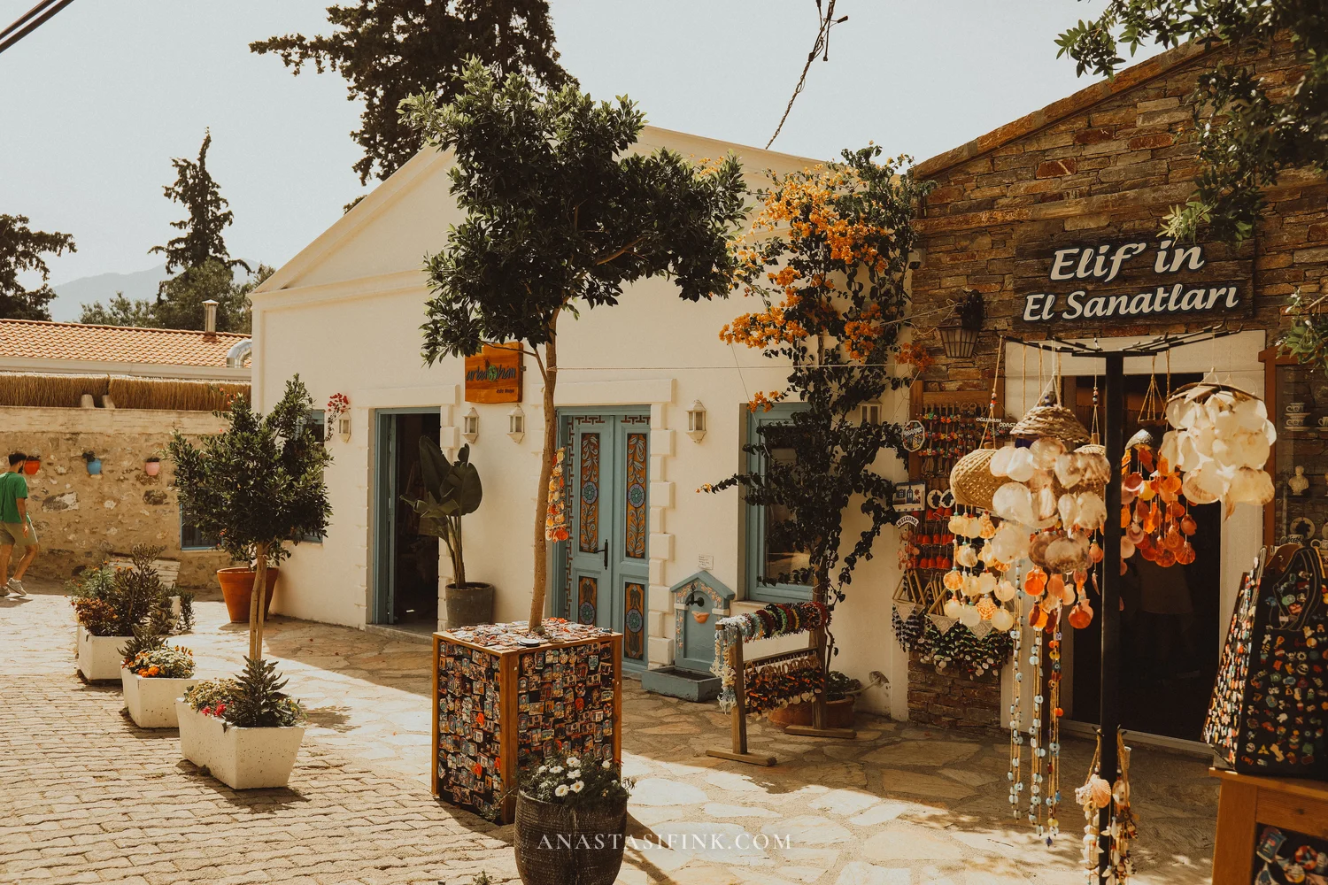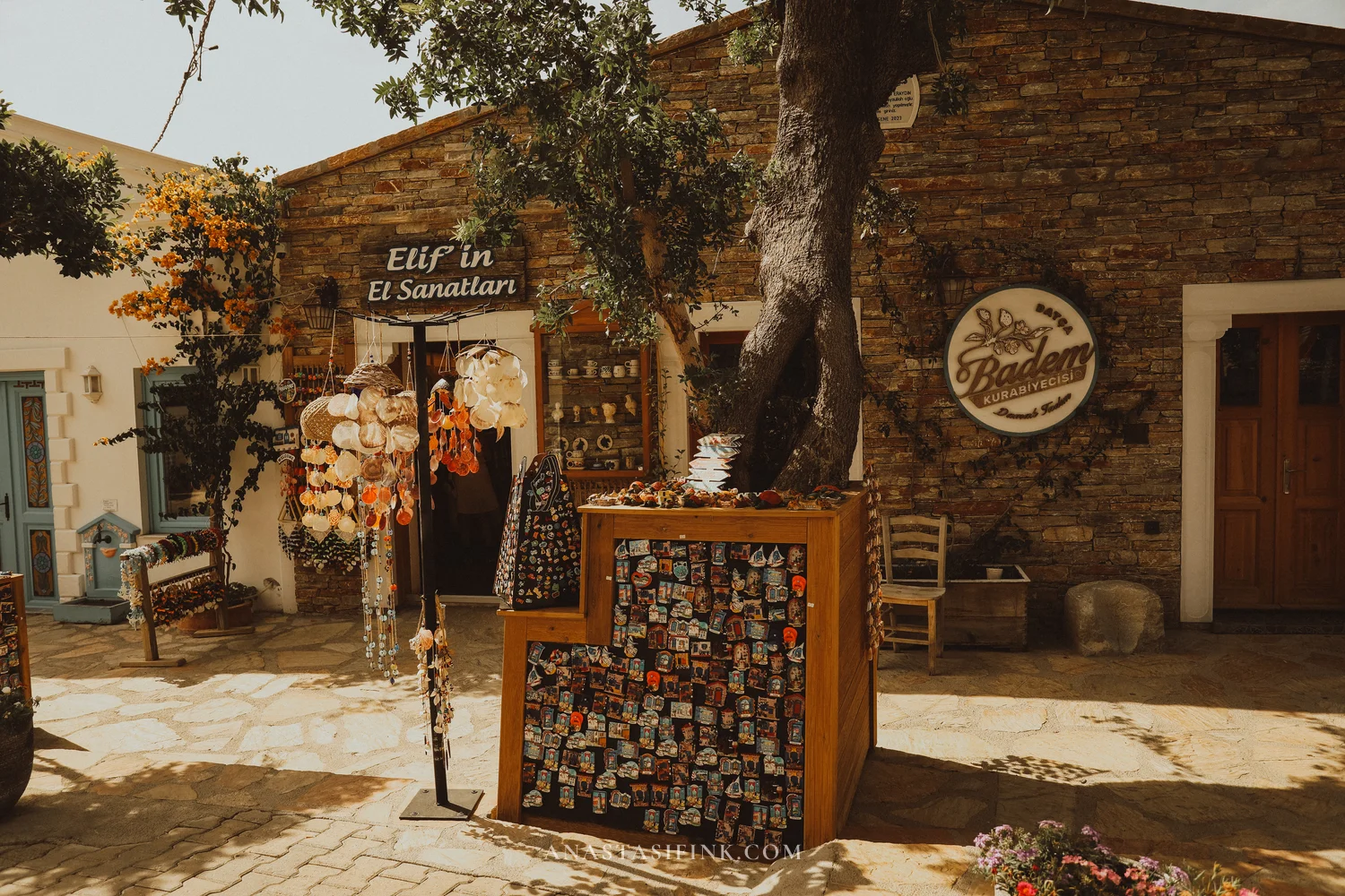 On the old town square there’s a shop called “Elif’in El Sanatları” — shell jewelry, magnets, handmade crafts. Right next to it is the “Badem” café (badem means almond in Turkish, naturally).