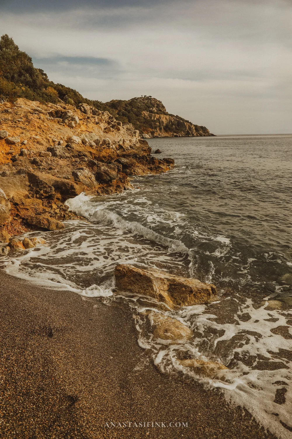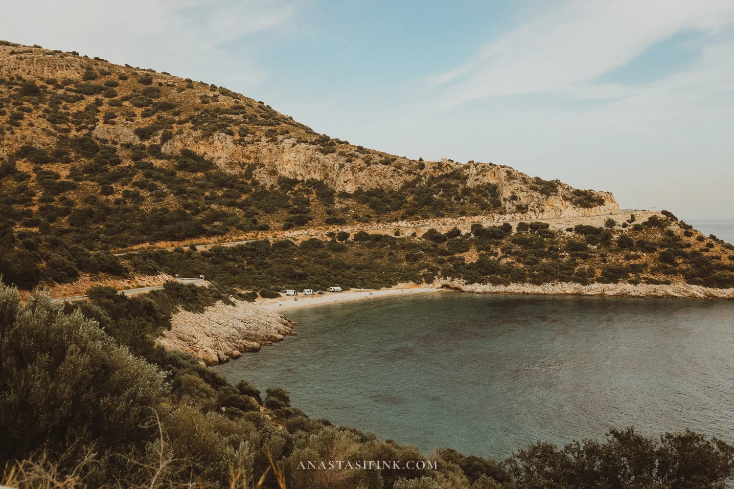 After the old town, we hopped back on the bike and kept riding along the peninsula toward the beaches. The road winds through the mountains with the sea and bays spread out below. Every few kilometers there’s a turnoff leading down to another beach.