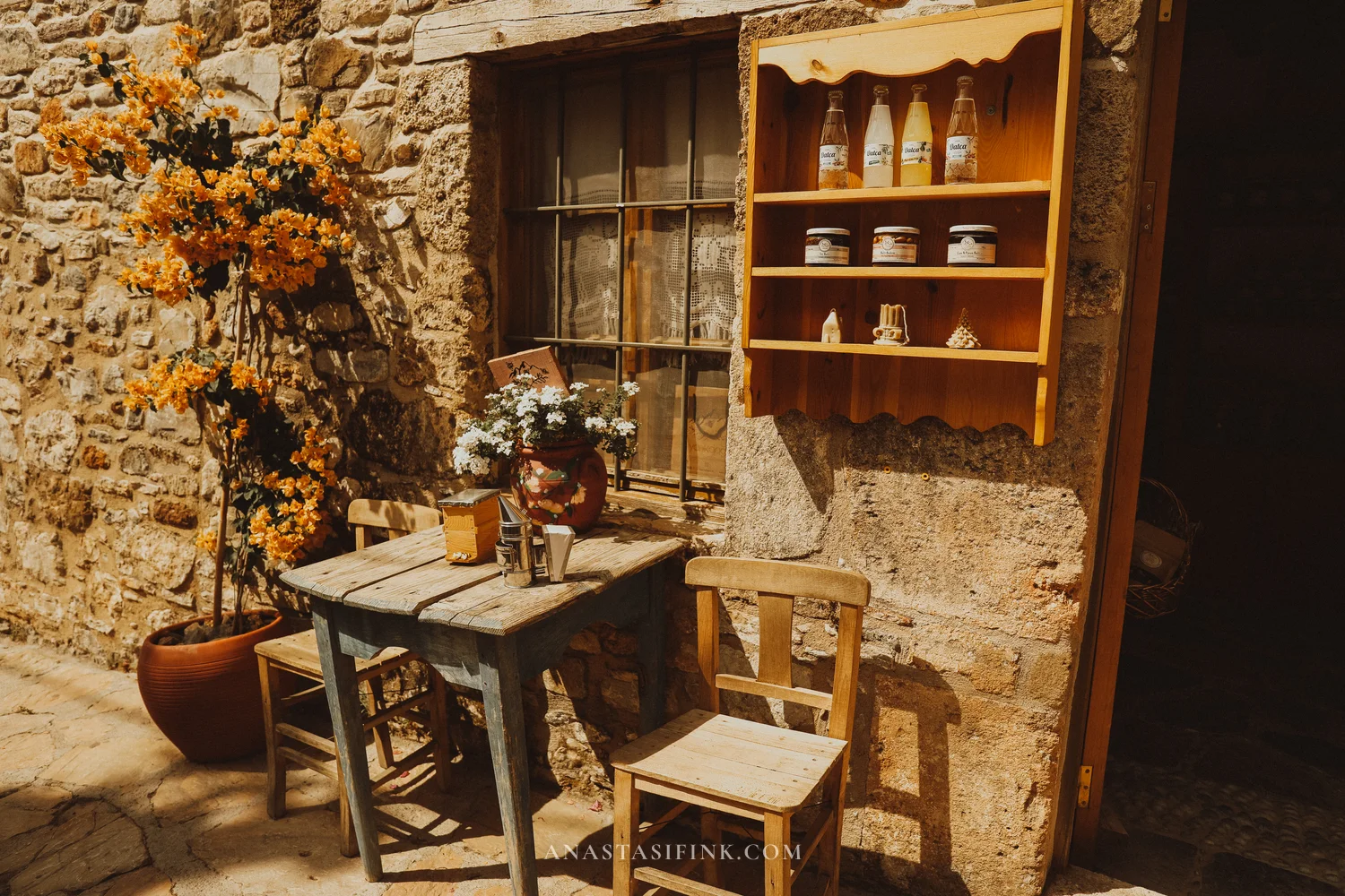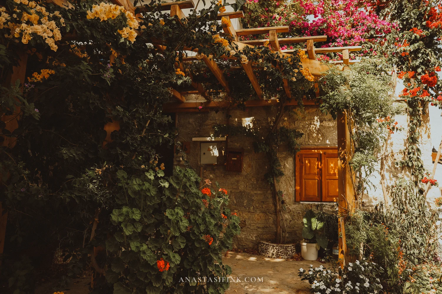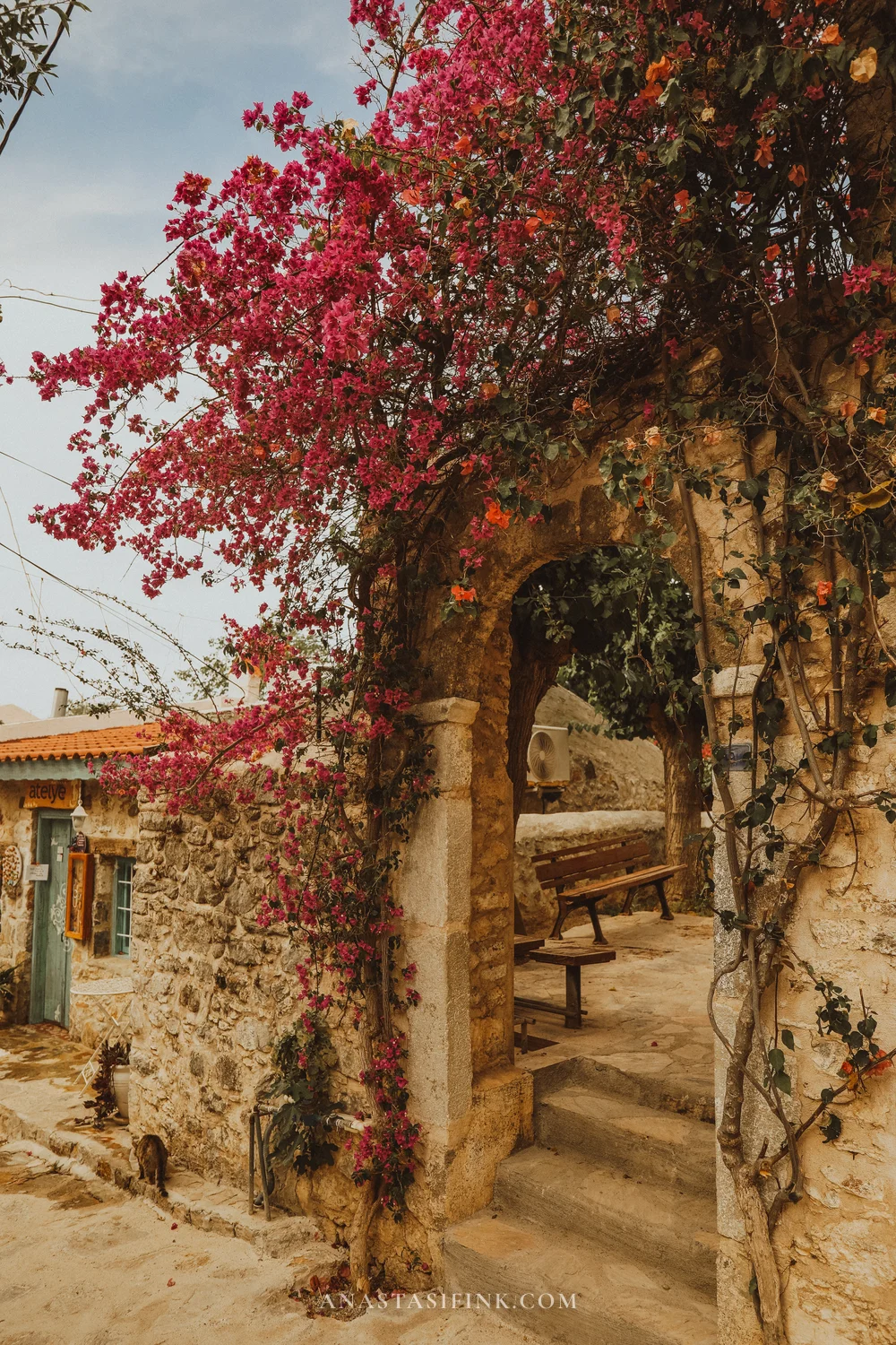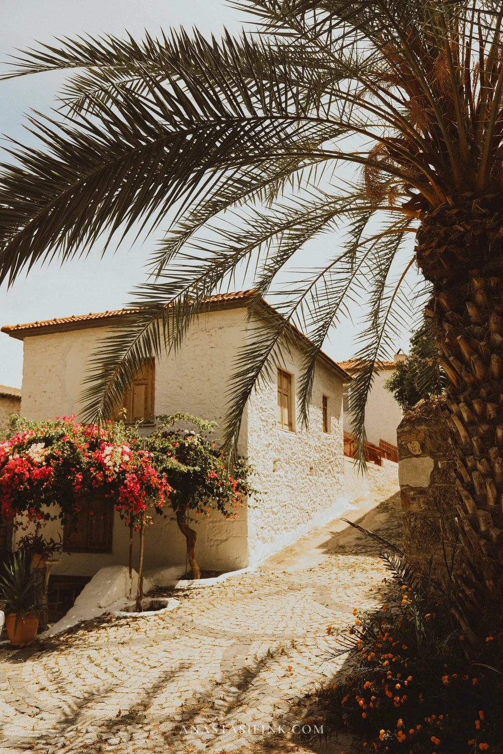 If you visit in June — everything is in bloom. Bougainvillea wraps around every other house, campsis (those orange trumpet-shaped flowers) pushes through the stones, and courtyards are full of jasmine in pots.