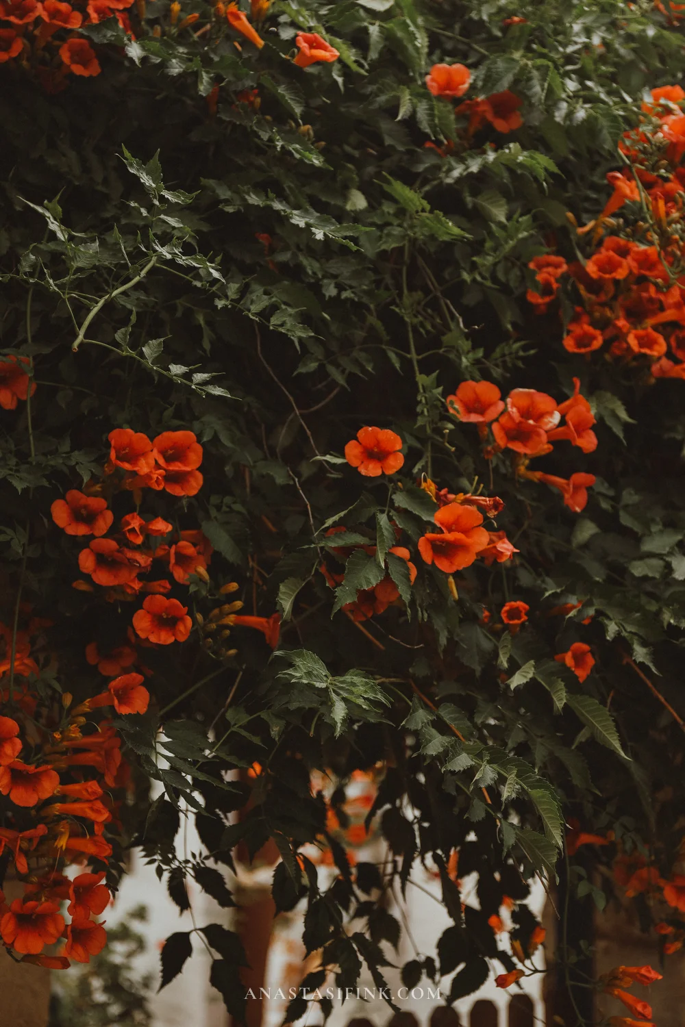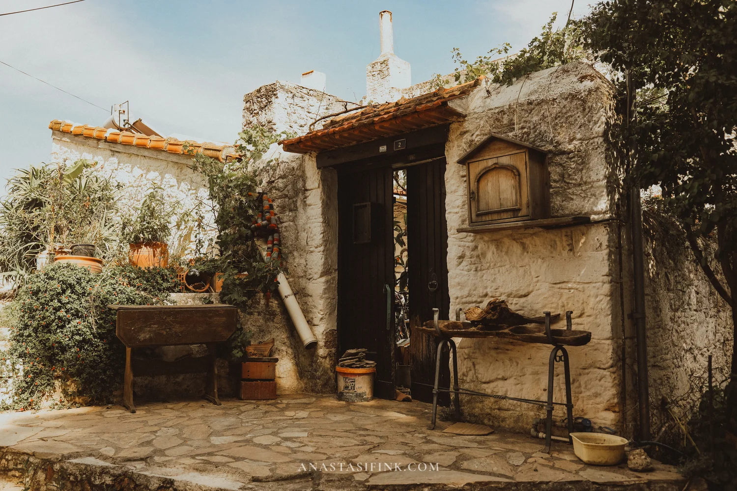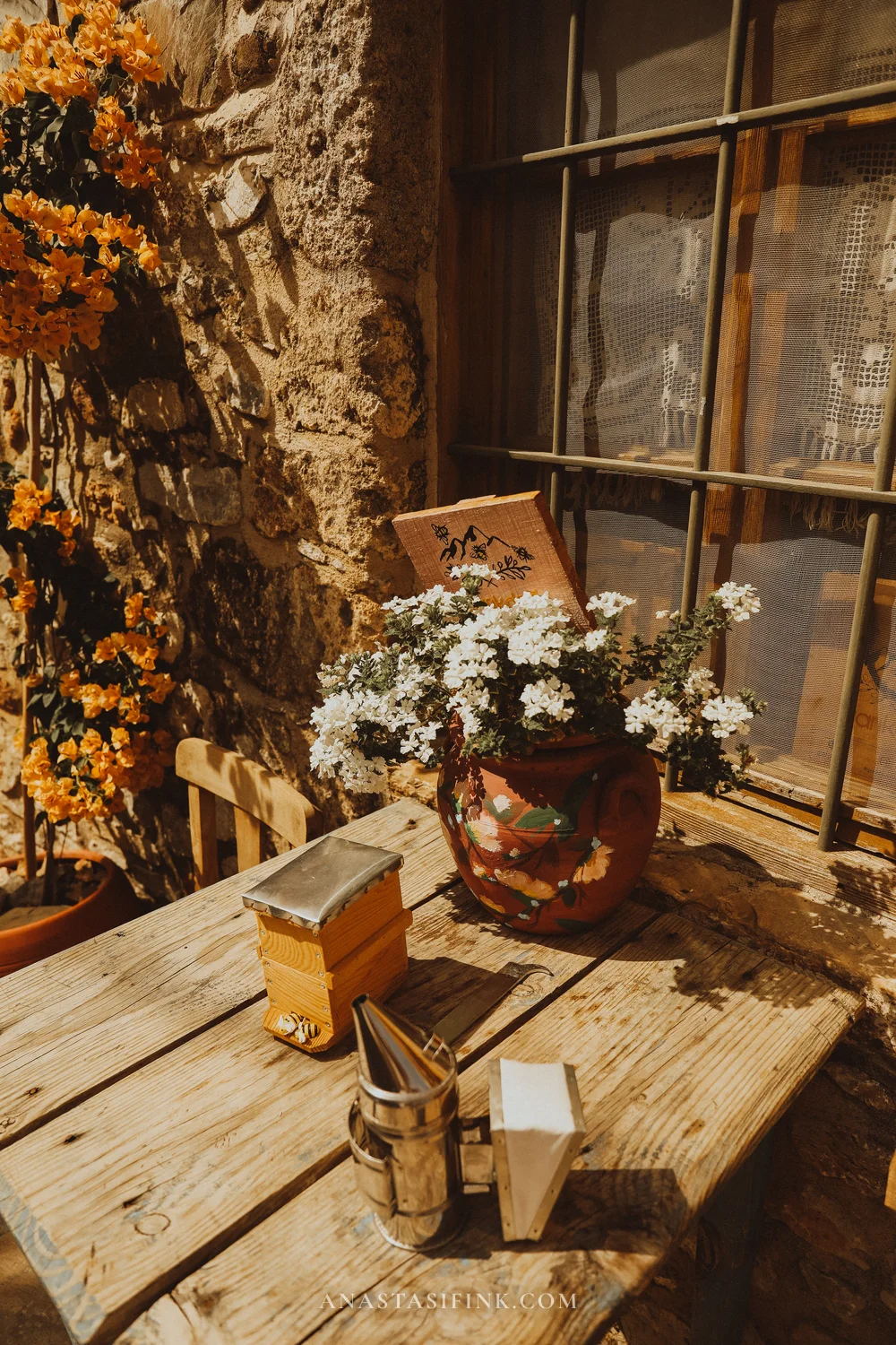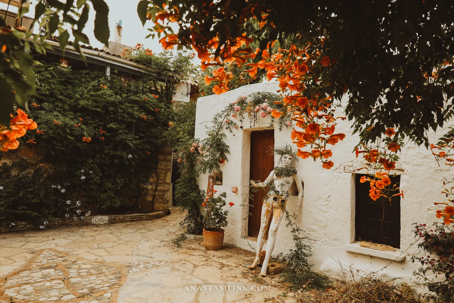 If you visit in June — everything is in bloom. Bougainvillea wraps around every other house, campsis (those orange trumpet-shaped flowers) pushes through the stones, and courtyards are full of jasmine in pots.