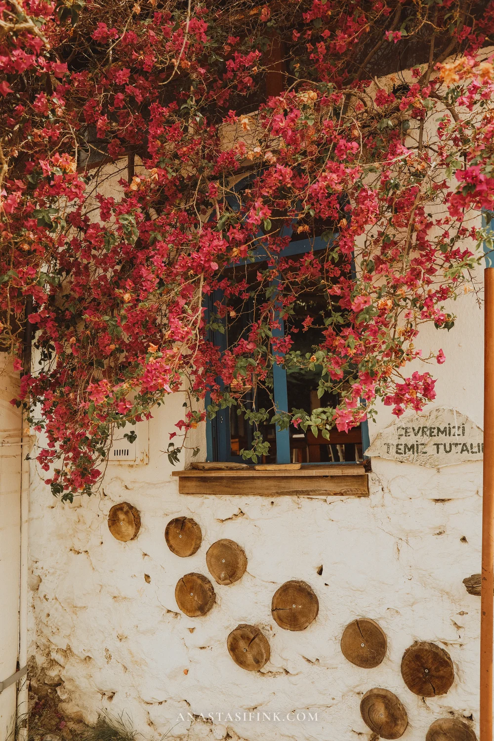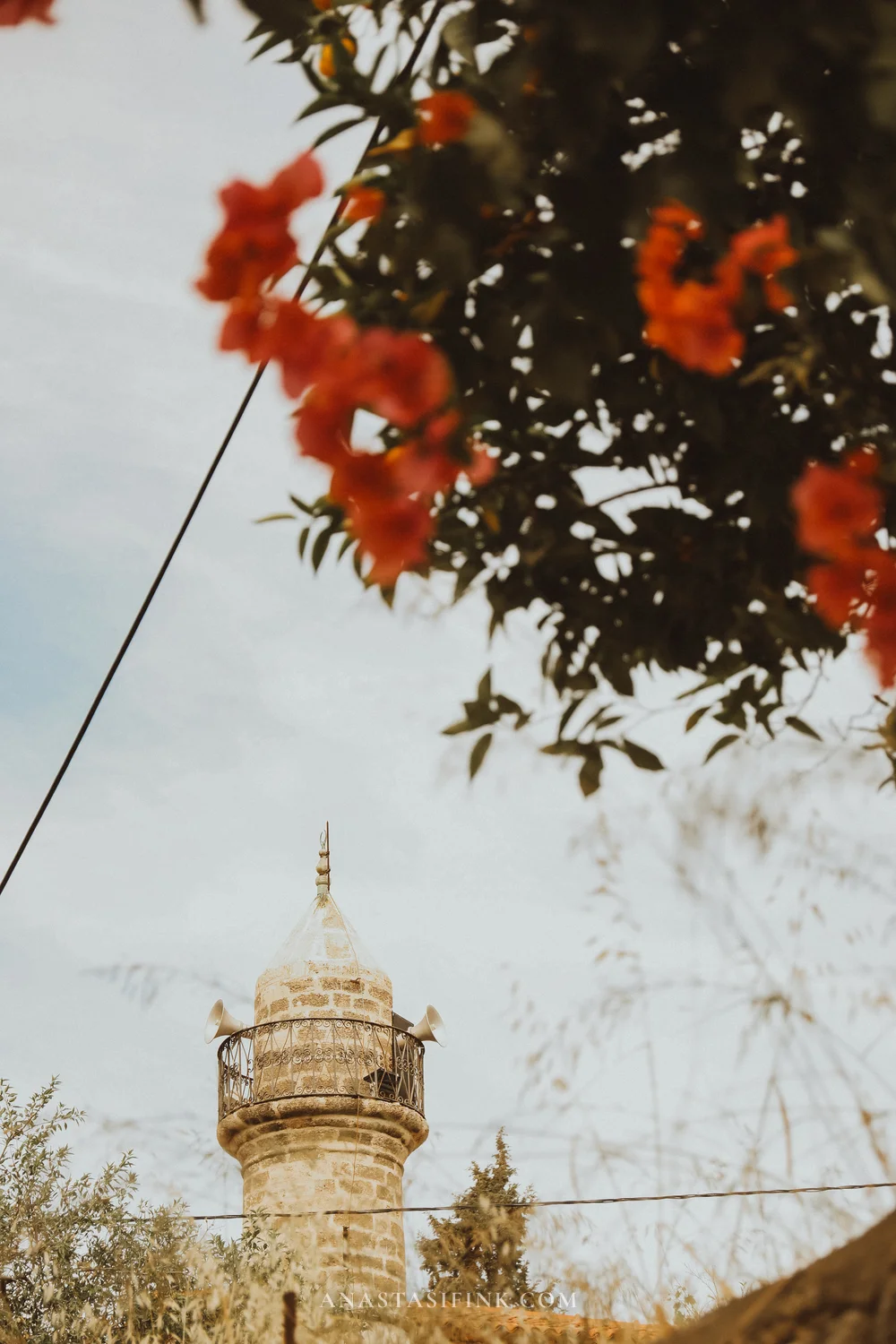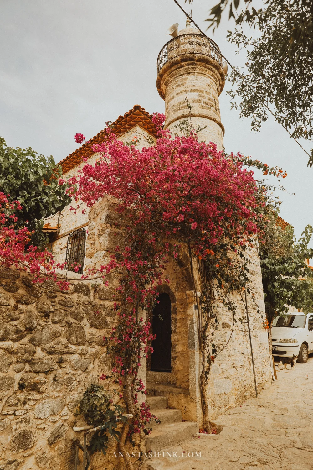 There’s a small mosque in the old town that’s easy to miss in summer — pink bougainvillea covers it almost entirely. Only the minaret peeks through.