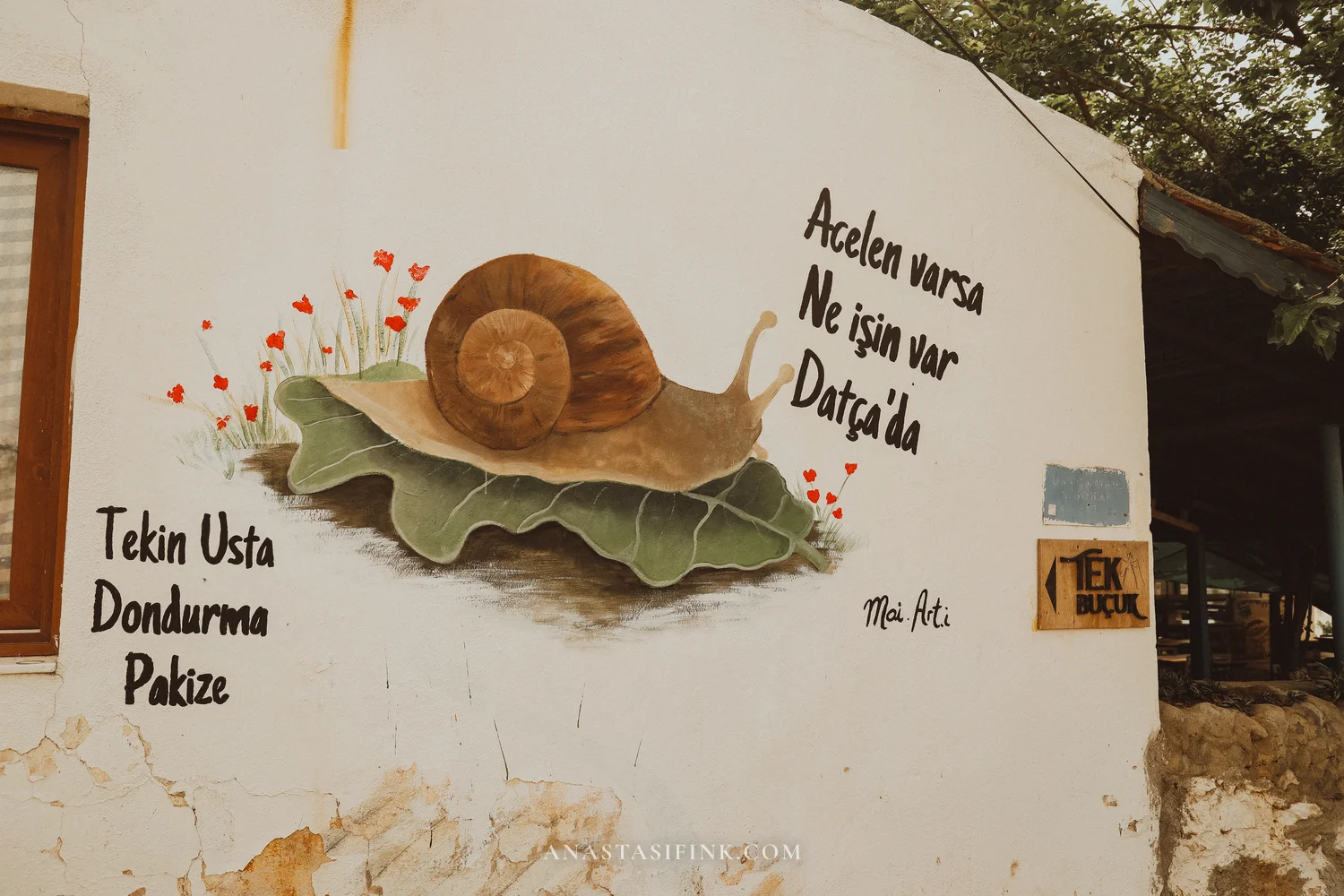 The most famous mural in Datça is the snail with the inscription “Acelen varsa, ne işin var Datça’da” (“If you’re in a hurry — what are you doing in Datça?”). It’s painted on the wall of the “Tek Buçuk” café, and right next door is “Tekin Usta Dondurma Pakize” — a pastry shop with genuinely good ice cream, by the way.