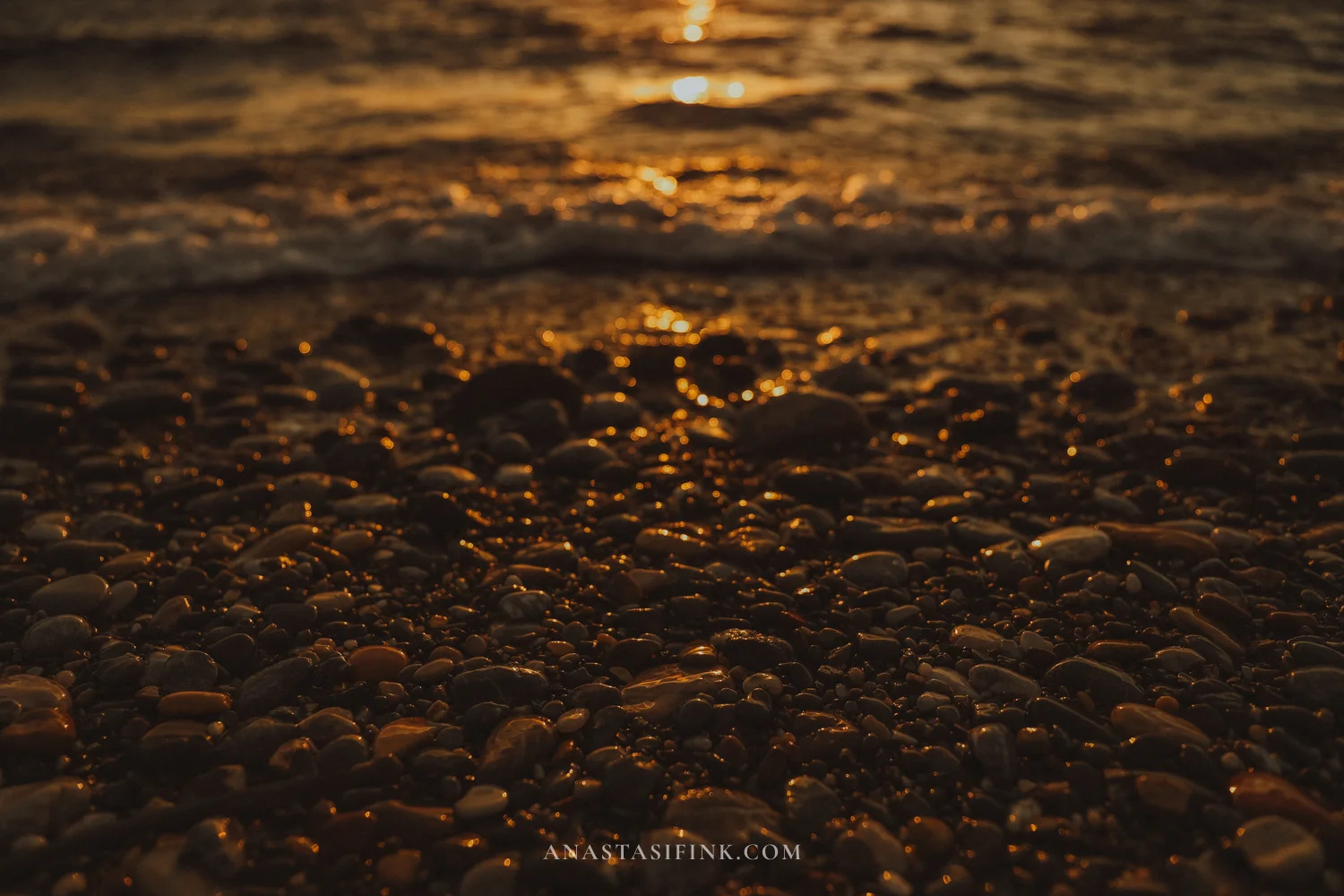 Pebbles at sunset — wet stones glistening