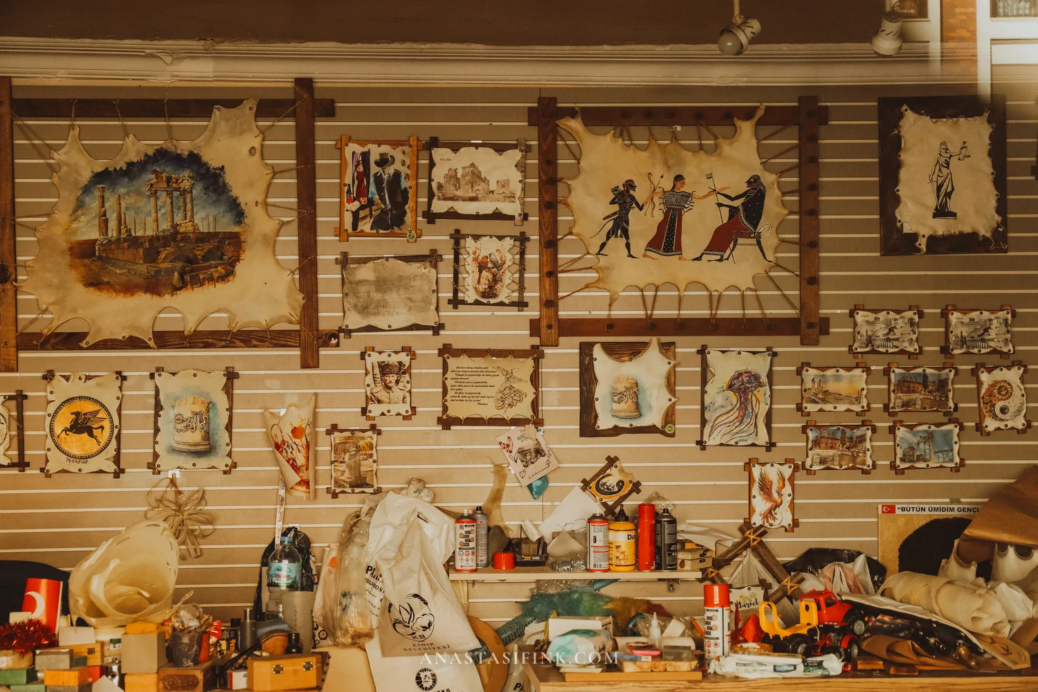 Dentro del taller — cuadros en pergamino con temas antiguos. Cada obra se realiza a mano