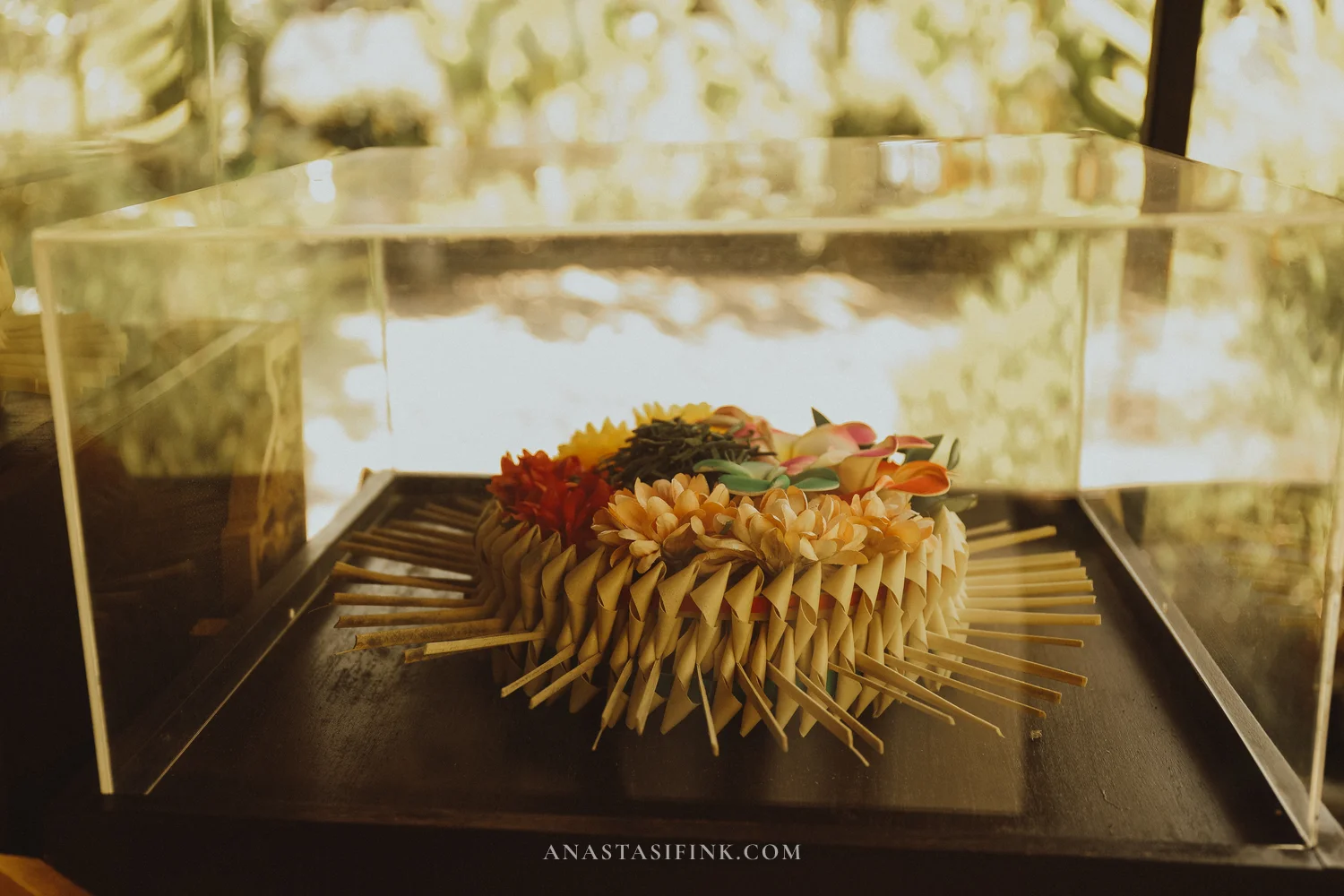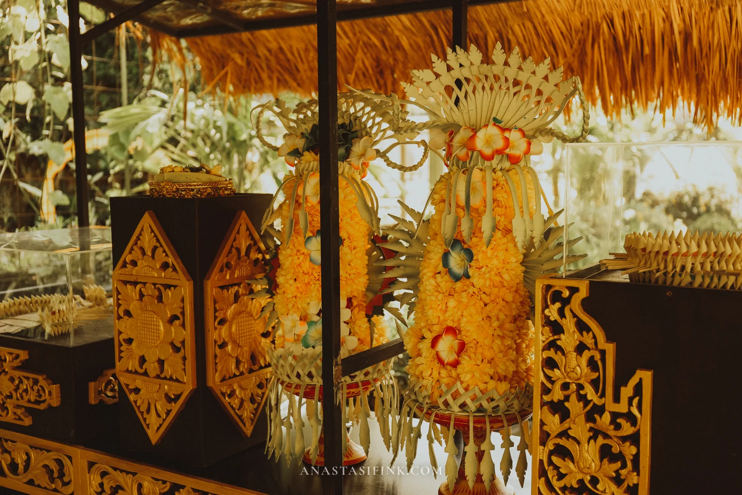 In a few of the pavilions, there are display cases showing offerings — the same kind you see every day at the doors of homes and shops across Bali.