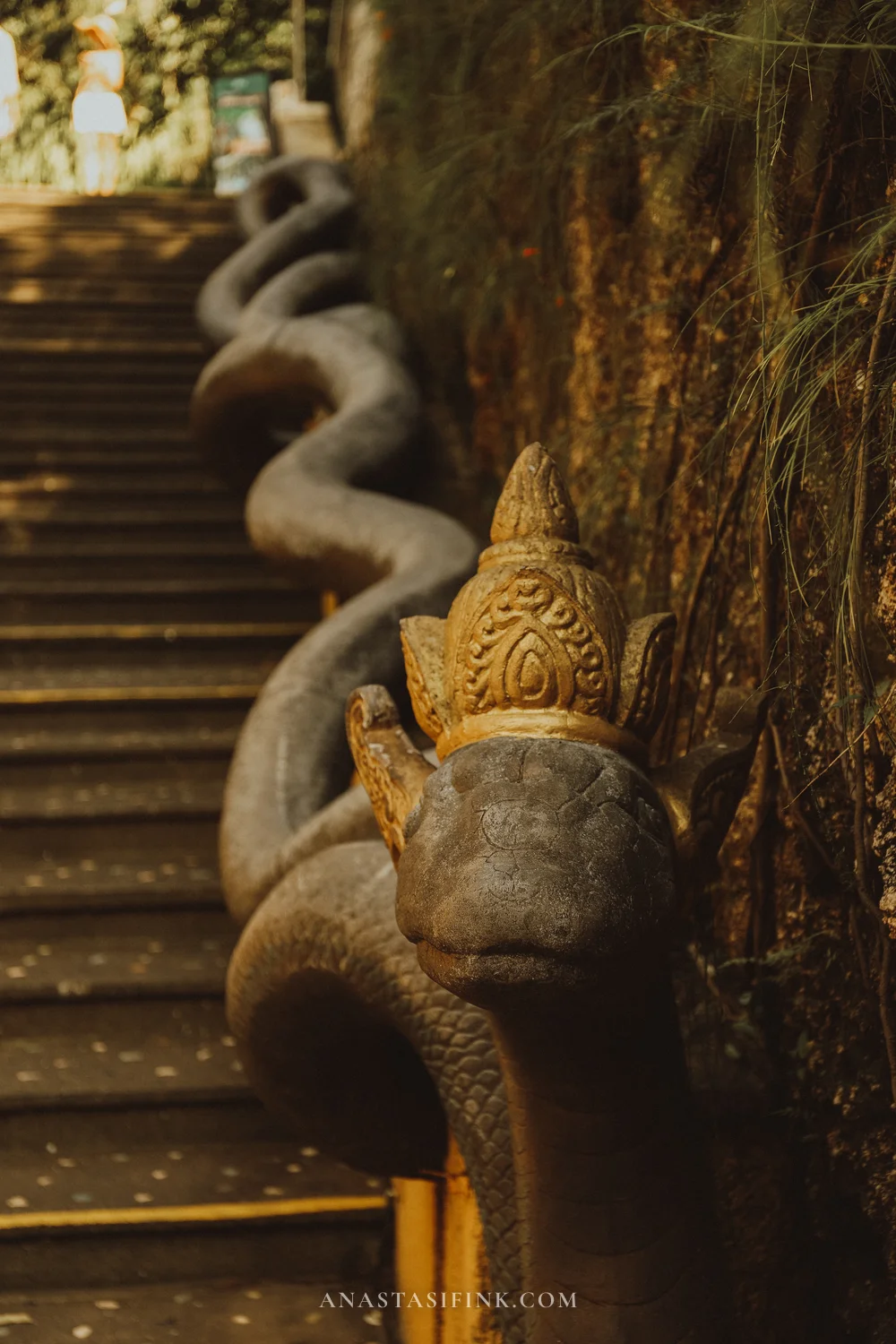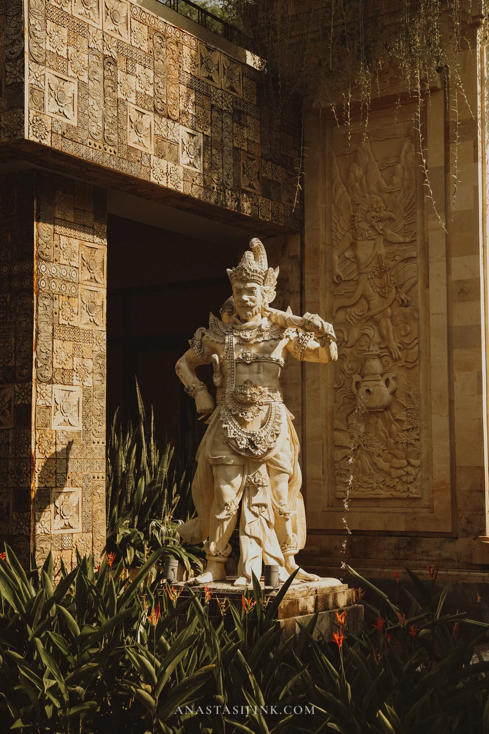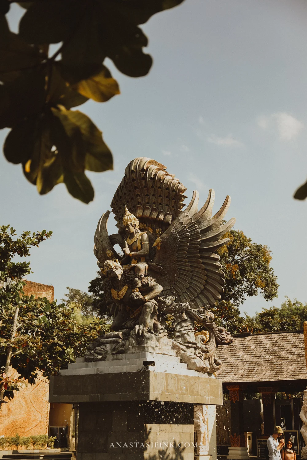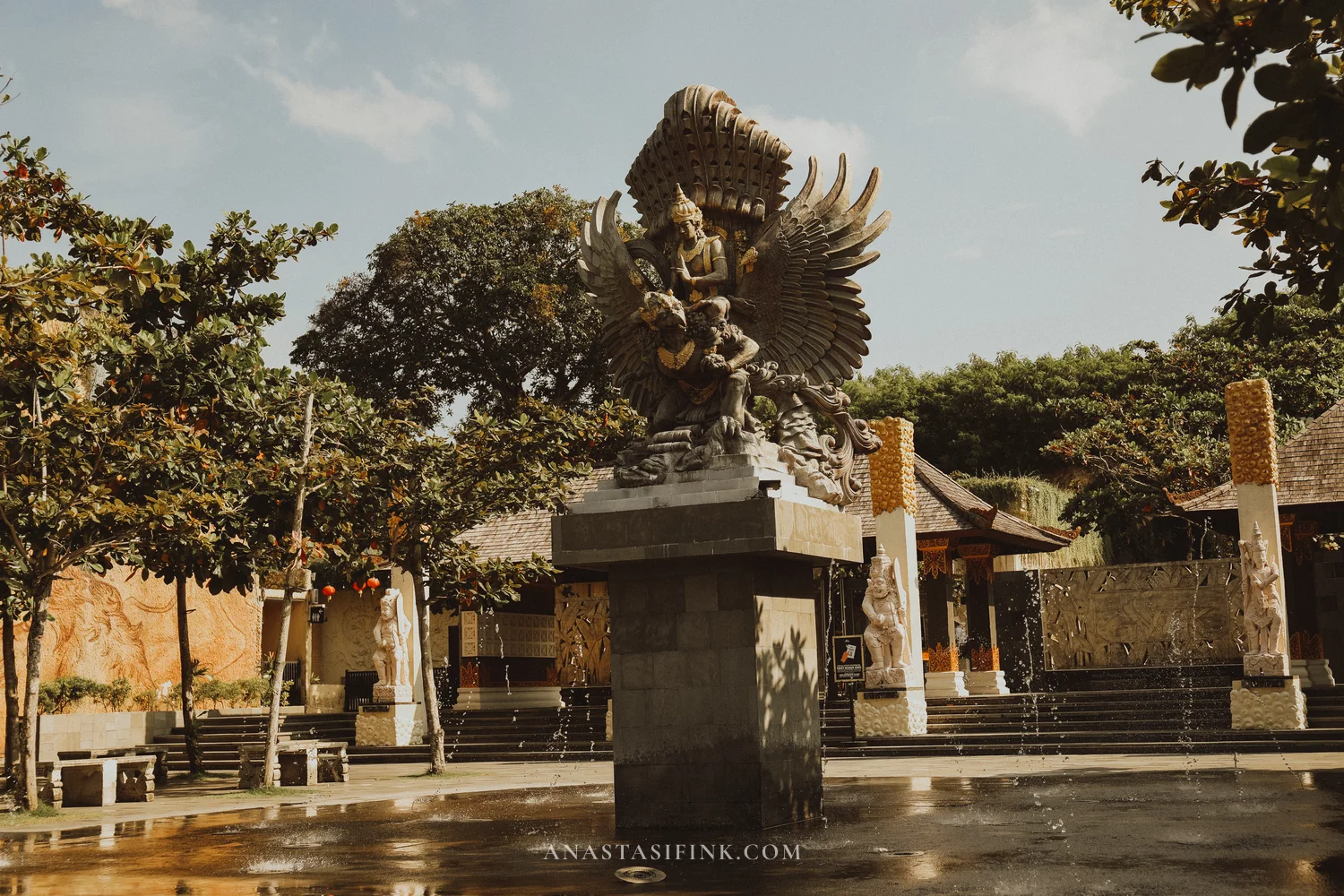 Right past the ticket booths, there’s a plaza with a fountain and a small golden statue of Garuda and Vishnu. A mini version of what’s waiting at the end.