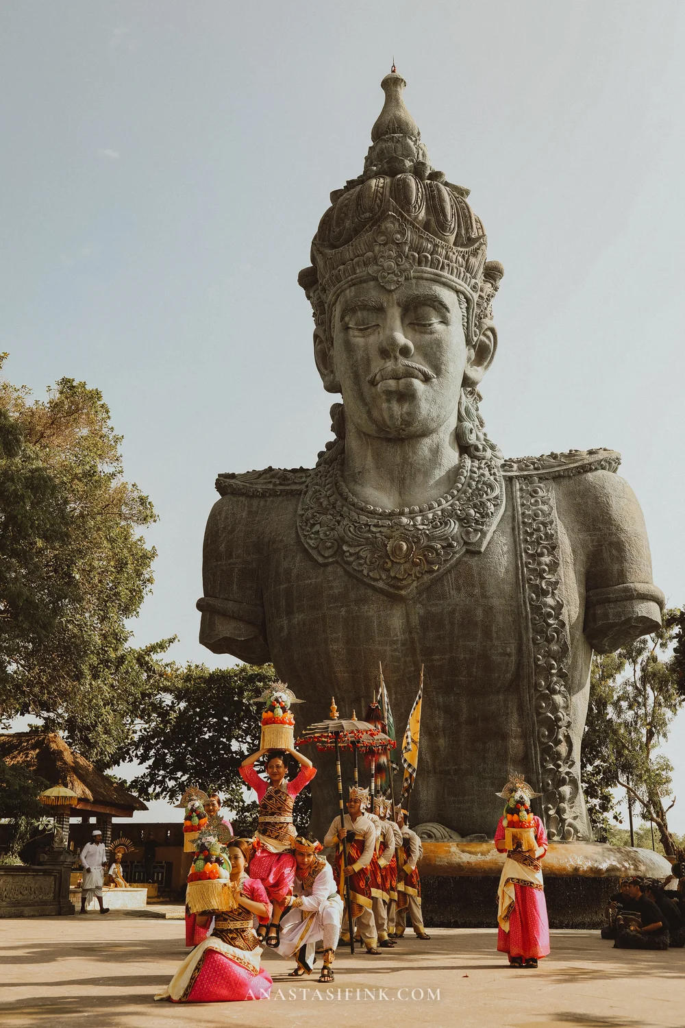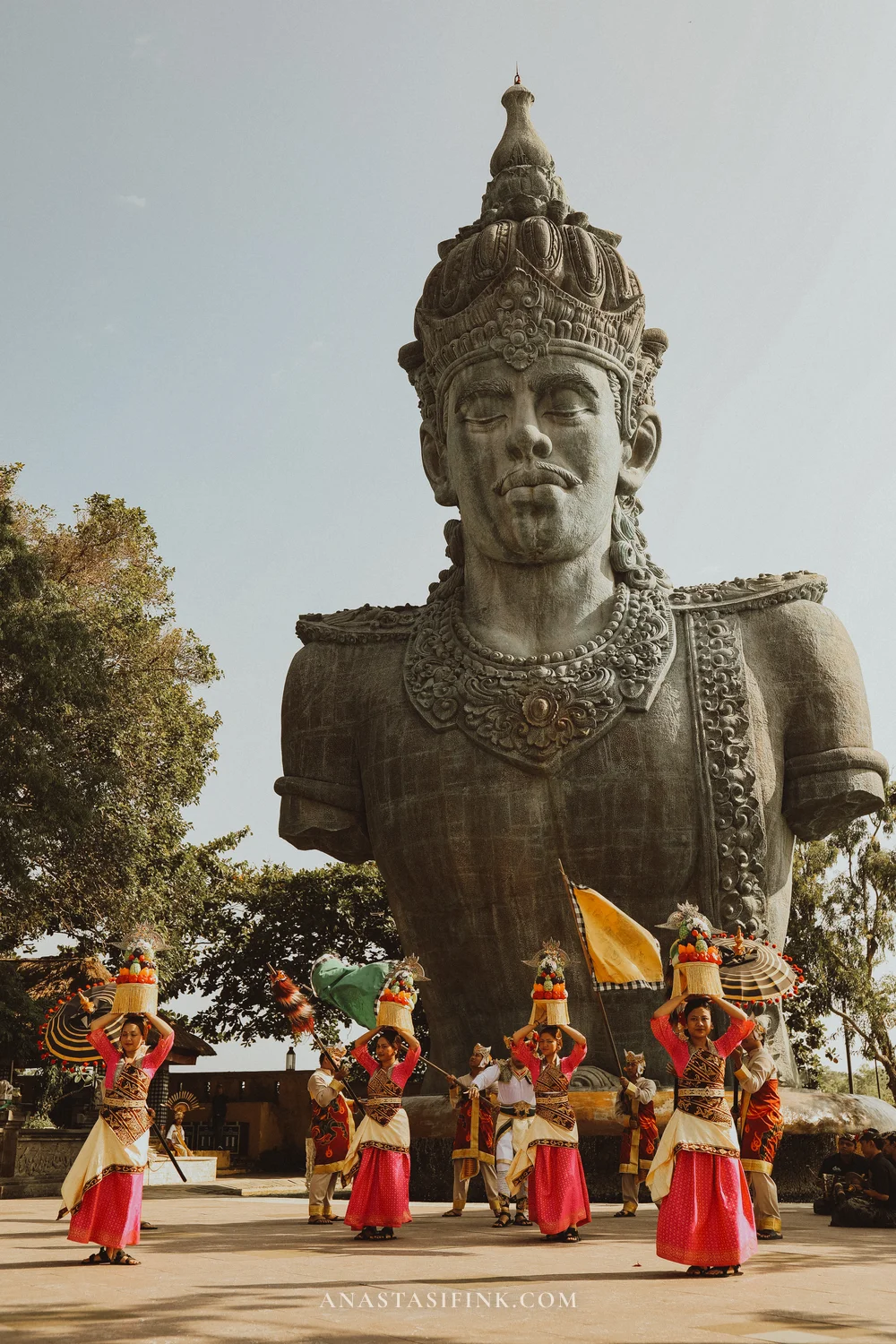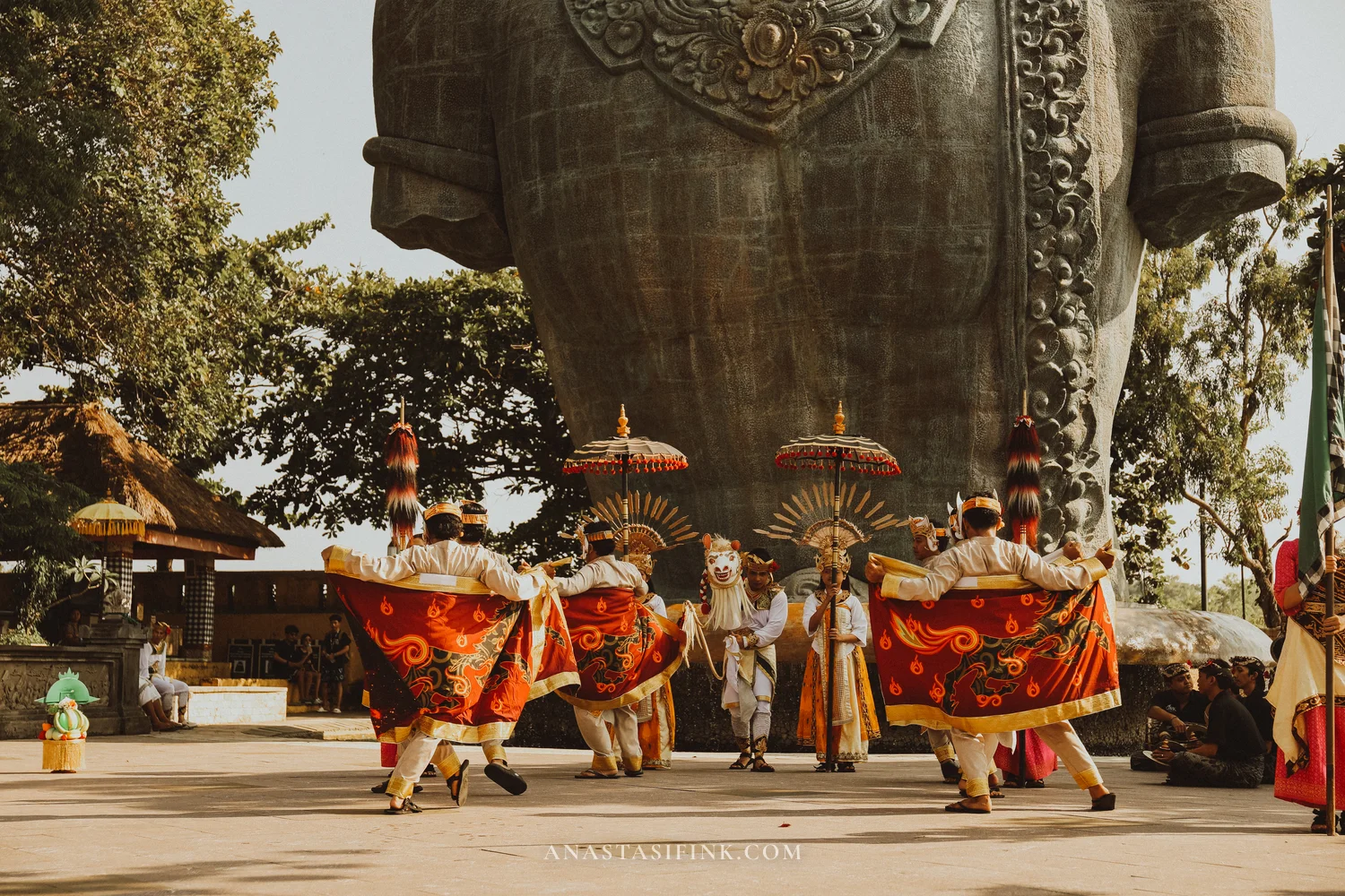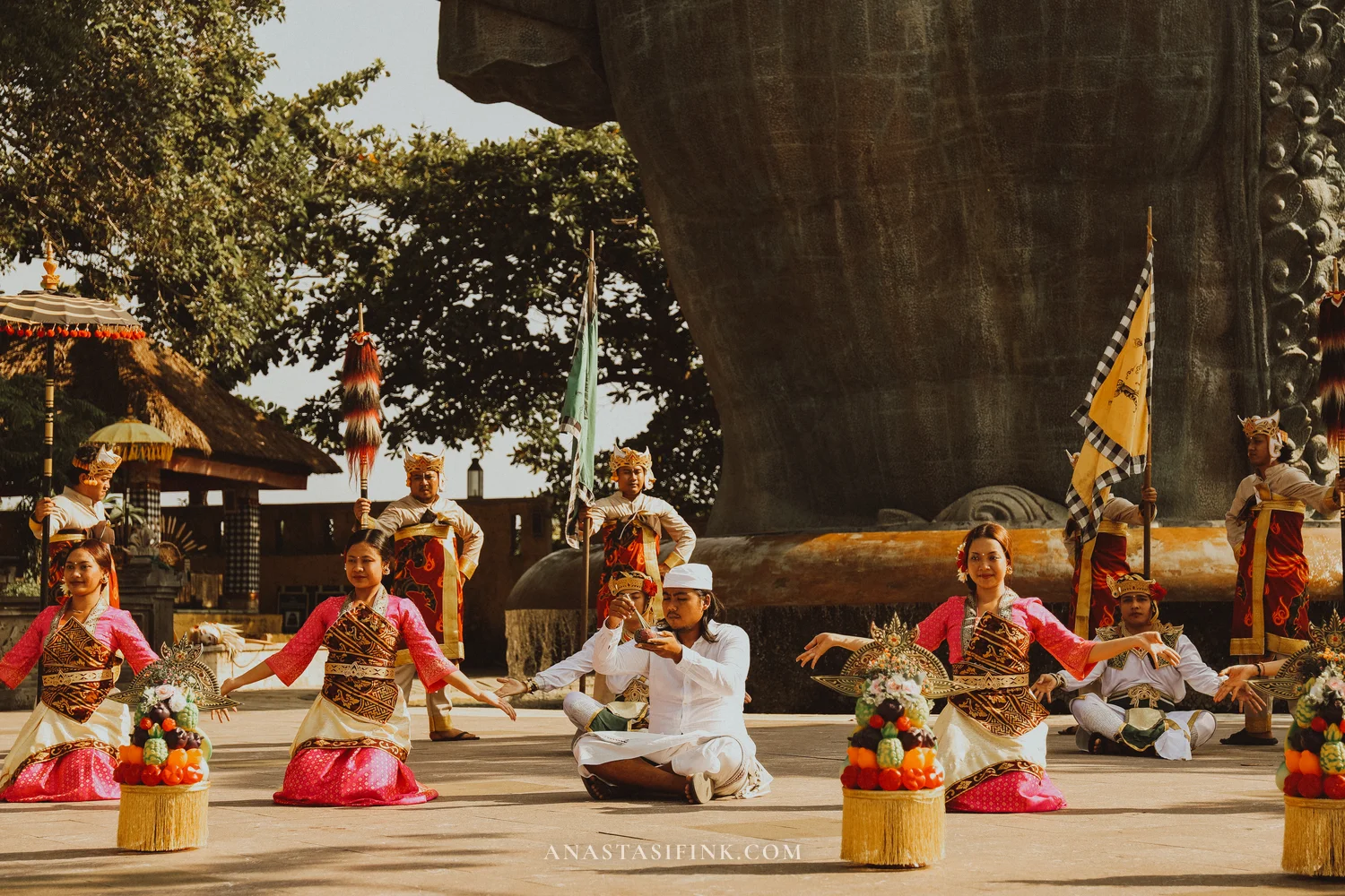 The contrast between the small figures in sarongs and the massive statue behind them — that alone is worth timing your visit around the dance schedule.