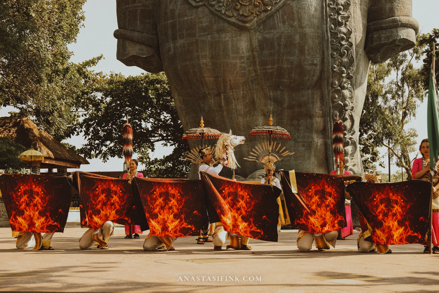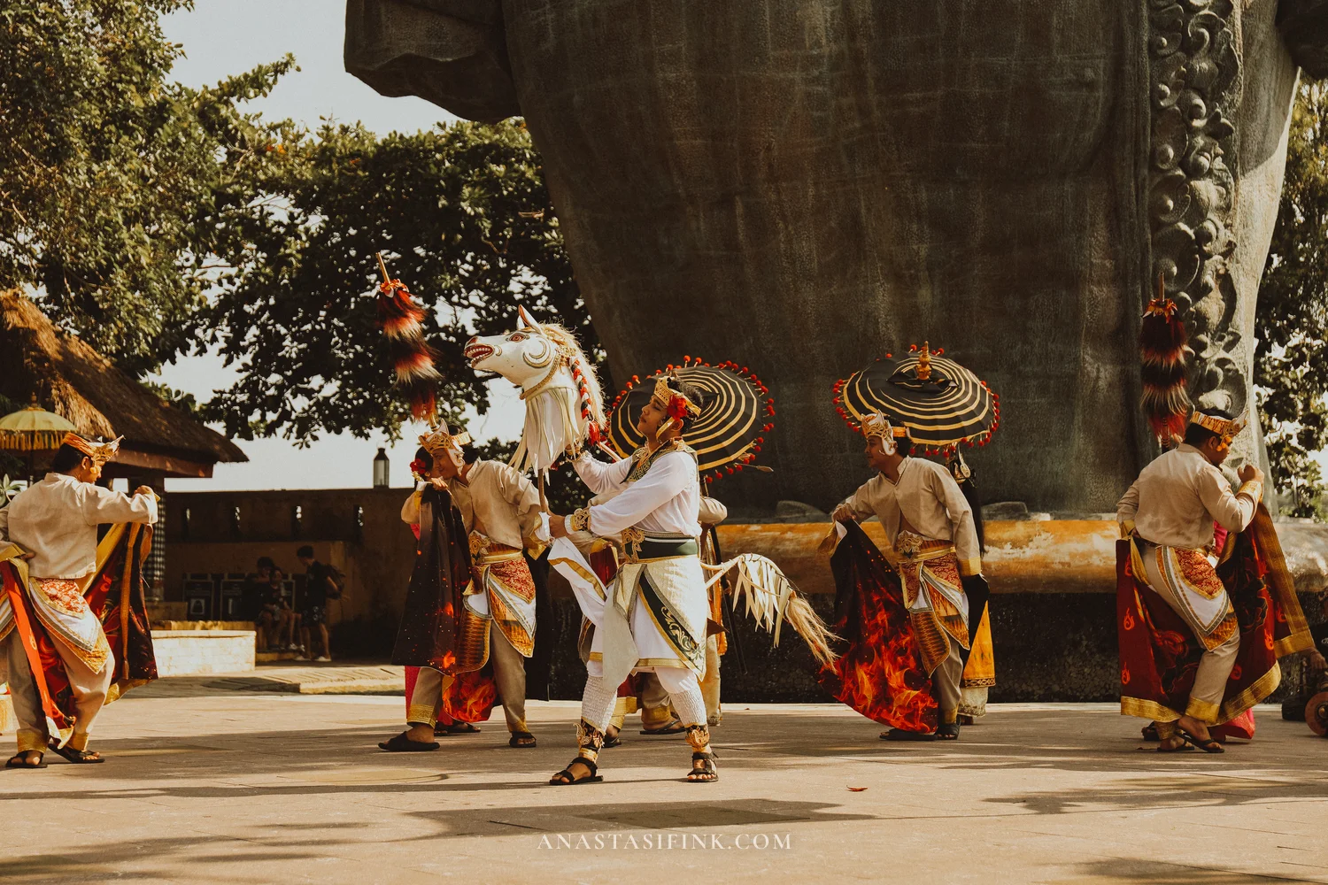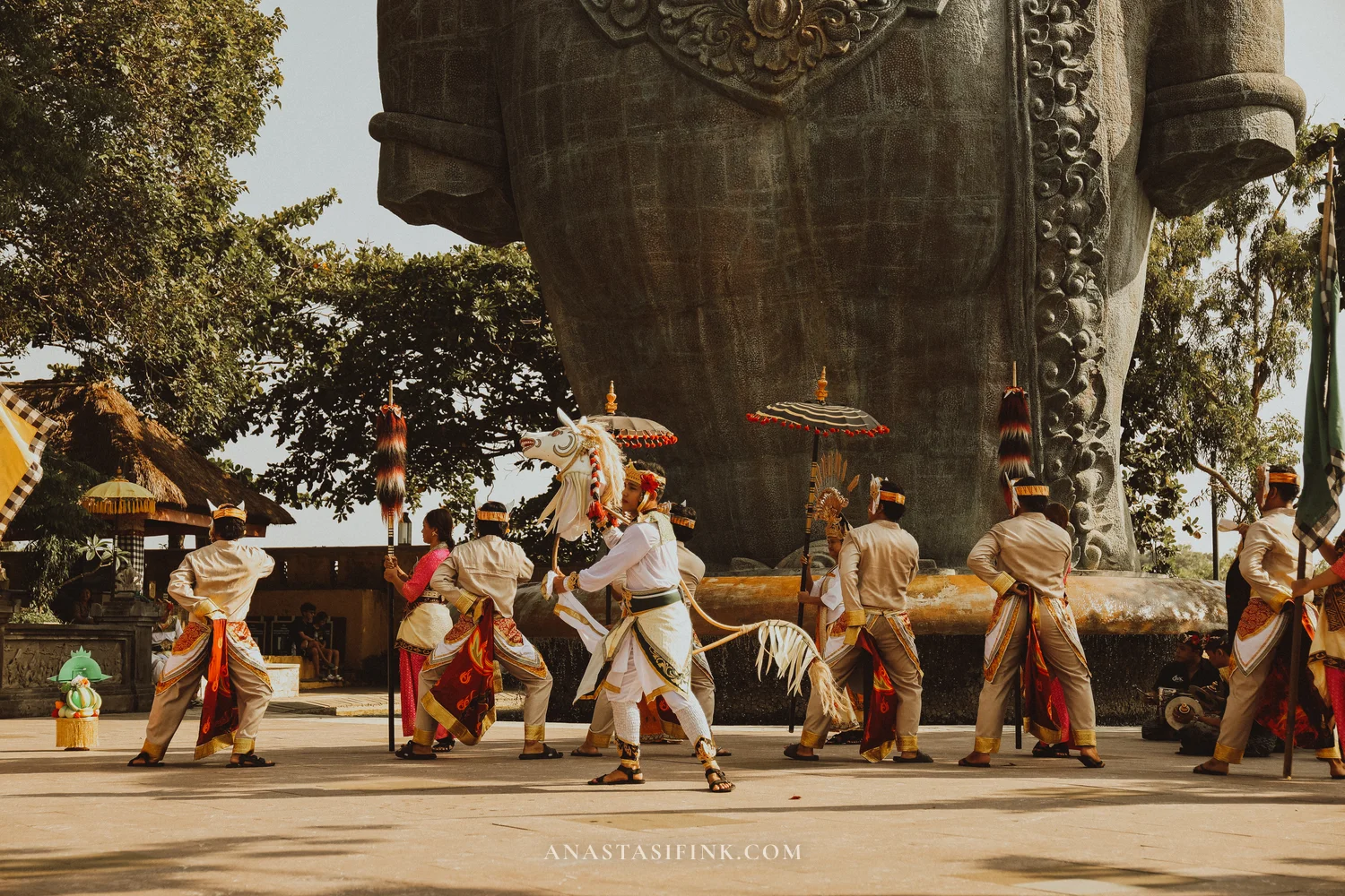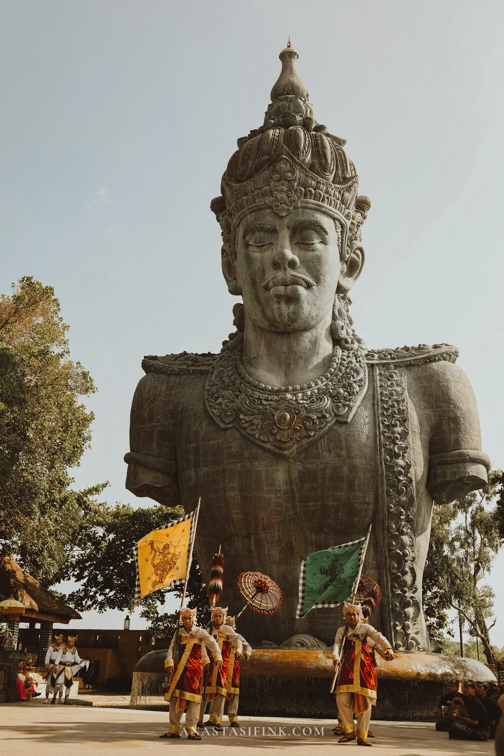 The contrast between the small figures in sarongs and the massive statue behind them — that alone is worth timing your visit around the dance schedule.