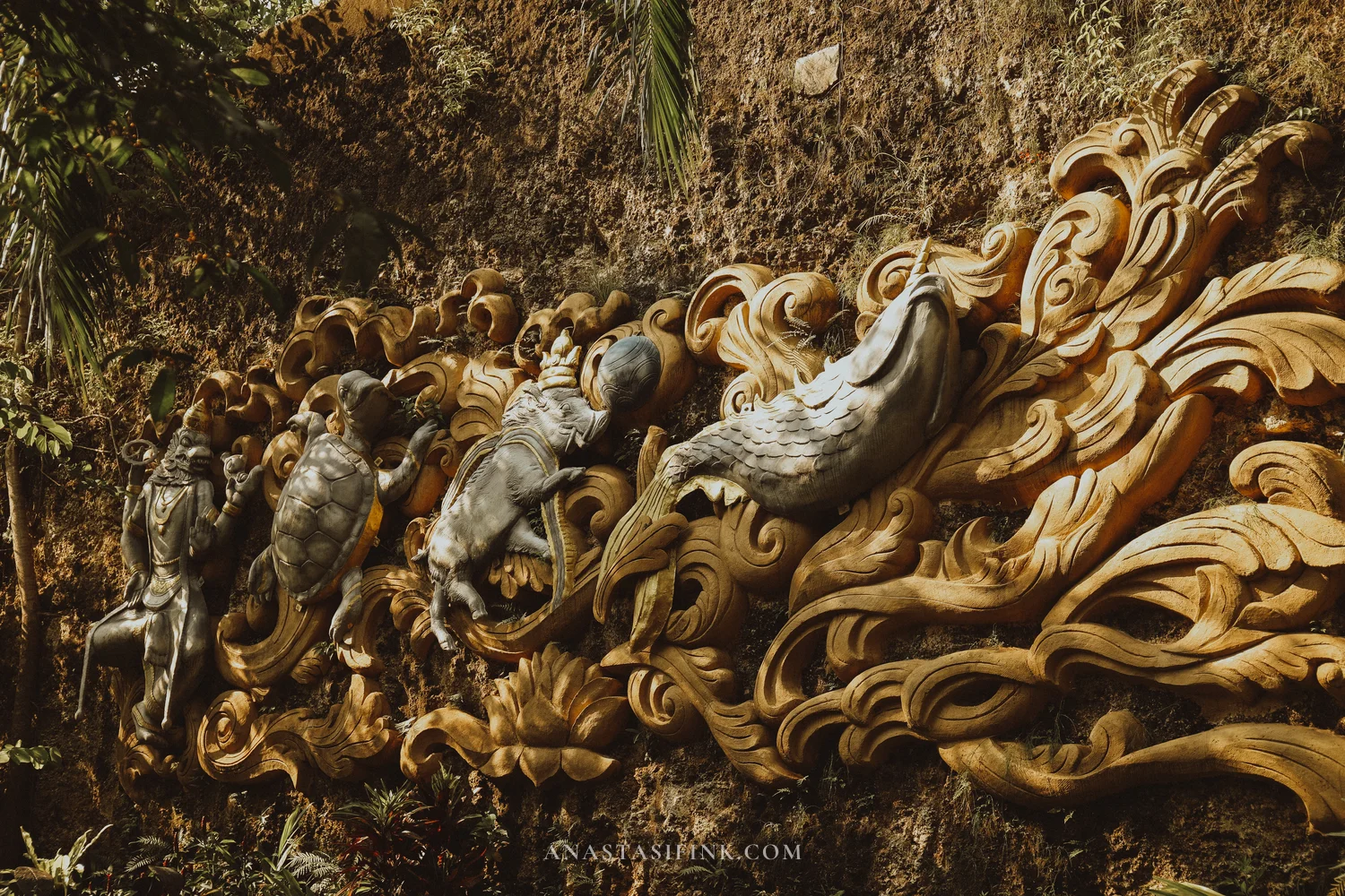 Further in, the park turns into a chain of tropical gardens and small open-air temples. Figures everywhere — goddesses, dancers, nagas, turtles.