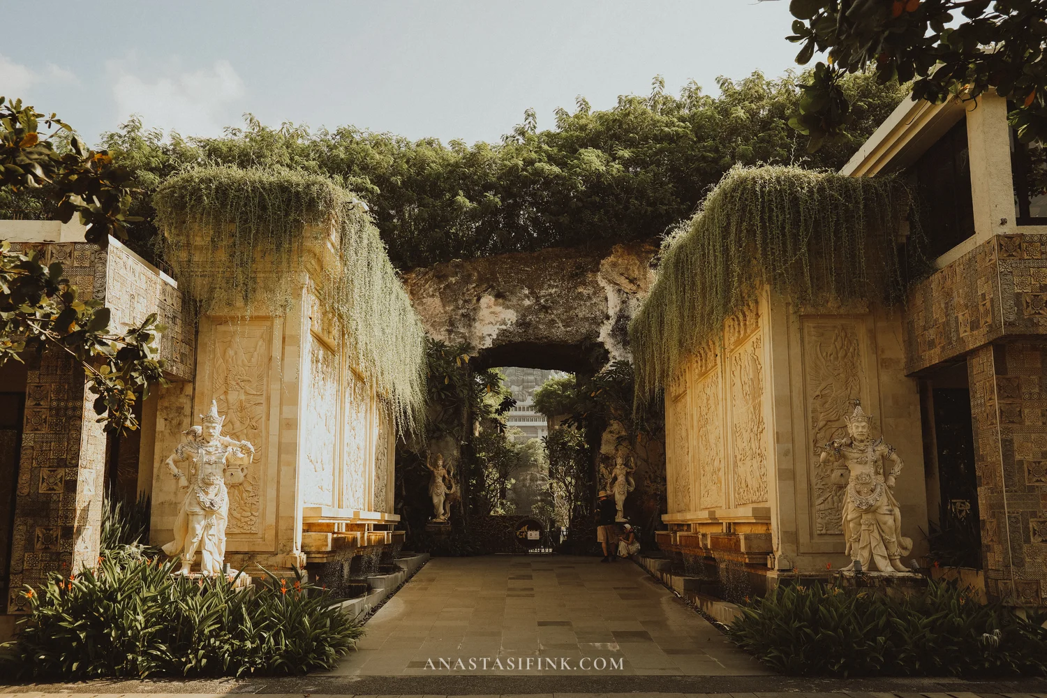 GWK Cultural Park in Bali turned out to be such a pleasant surprise. I came here a little skeptical — just to see the giant Garuda Wisnu Kencana statue that you can spot from anywhere on the Bukit Peninsula. But the park had way more in store: a massive grounds, Balinese dance performances right at the foot of the statue, tropical gardens, and these incredible corridors carved straight into the limestone cliffs!