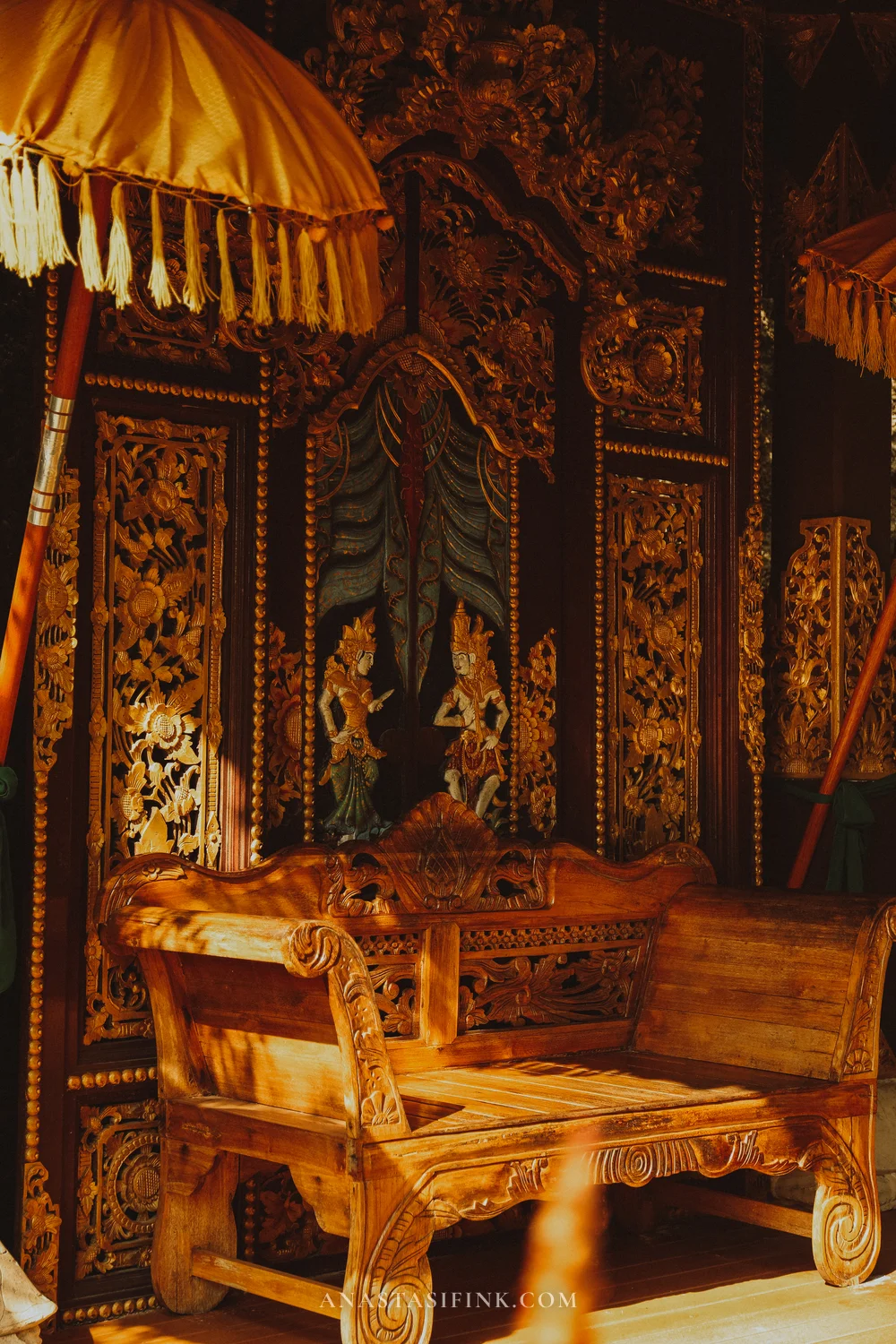 Balinese woodcarvers work without blueprints — the craft passes from generation to generation, and every pattern lives in the master’s head before the chisel ever touches the wood. The swirls and curls hide the elements (fire, water, wind), mythical creatures, and protective symbols. Even a single Balinese pavilion can hold your attention for hours — every detail has its own story.