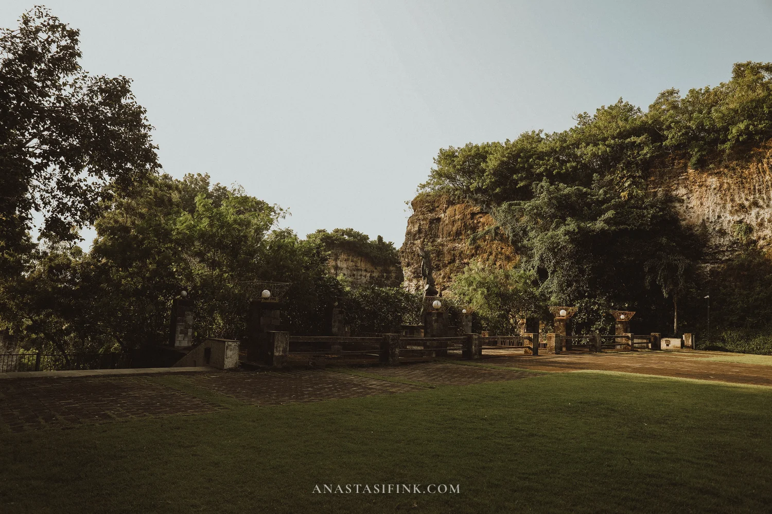 The park sits on the site of an old limestone quarry. For decades, stone was hauled out of here for villages in southern Bali. When the land was handed over for the park in the 1990s, the architects made a bold call: leave the vertical quarry walls exactly as they were, and run pathways straight between them. The result is something completely un-Balinese — narrow stone canyons that open up onto the main statue.