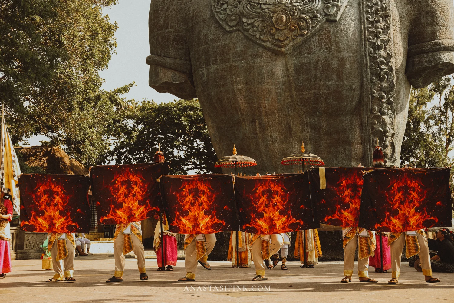 I caught a daytime performance right at the foot of the main statue — and it was probably the second strongest impression of the entire day. Dancers in red and gold costumes, gamelan music, processions with offerings balanced on heads!