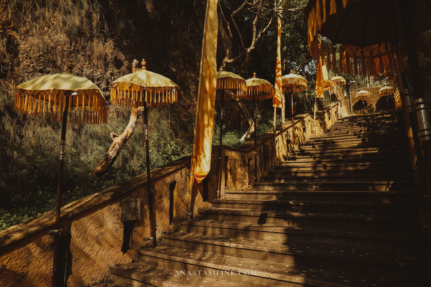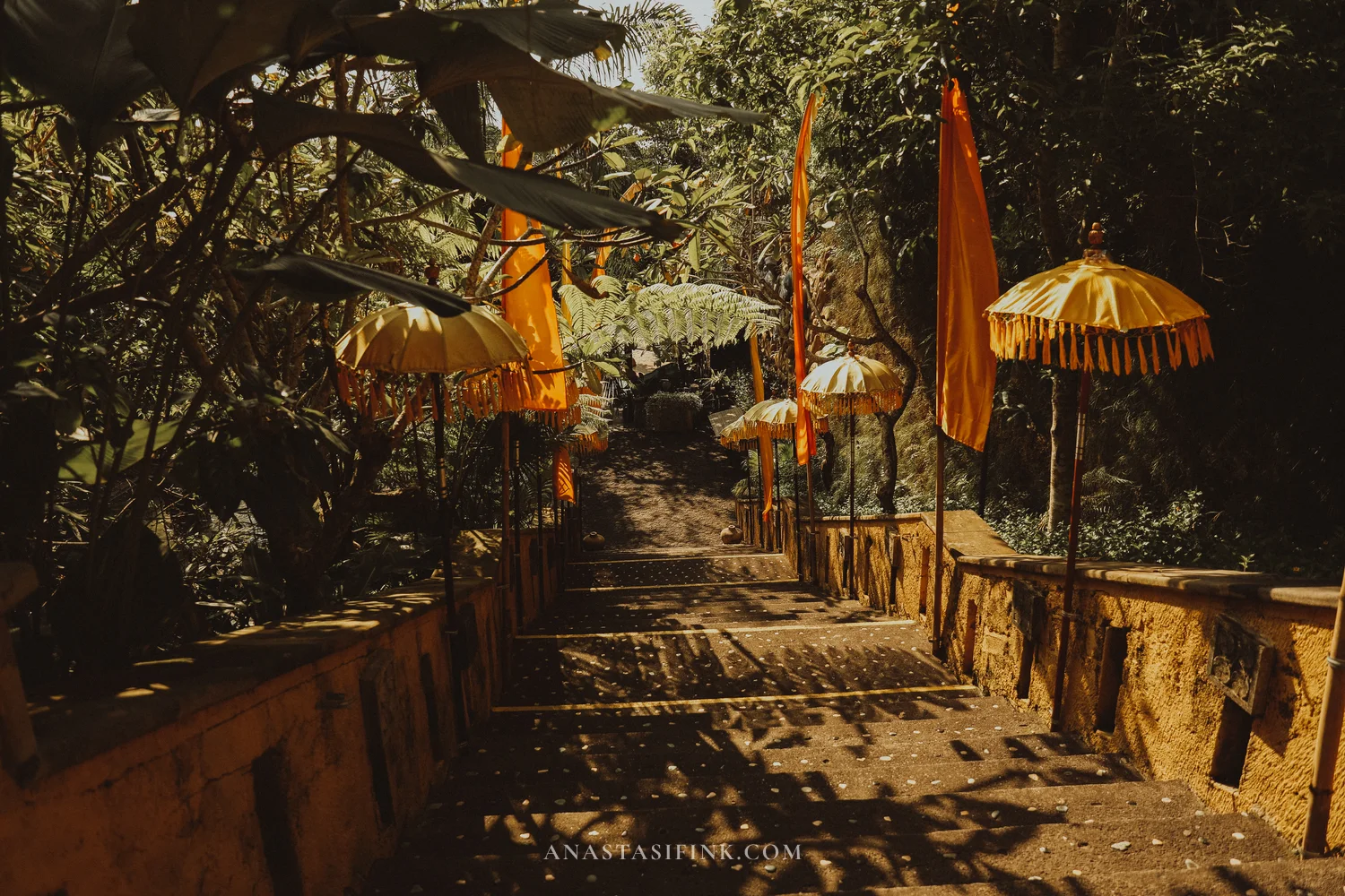 You see payung umbrellas everywhere in Bali. They’re not just decoration — they’re part of the temple tradition, a symbol of spiritual protection. Each color carries its own meaning: yellow ones, like the ones here in the park, represent prosperity and spiritual light; white ones stand for purity; black ones for protection from evil; red ones for strength and passion. Payung get placed near altars, at temple entrances, beside sacred trees. If you look closely, you’ll spot them at almost every Balinese ceremony.