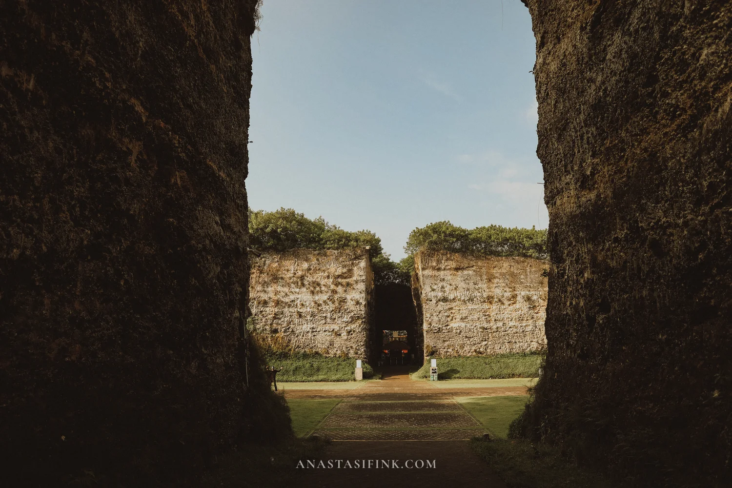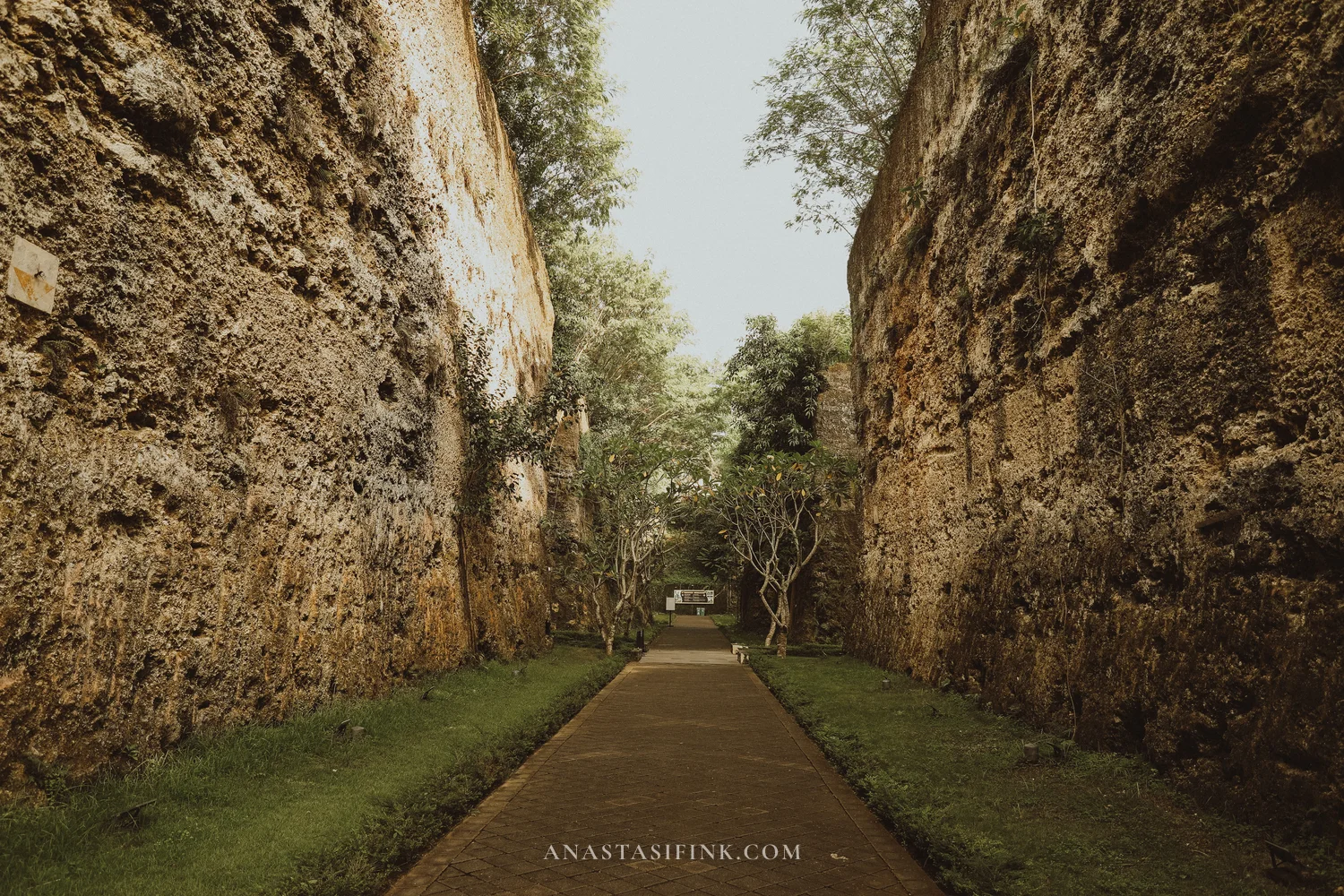 The walls rise about 25 to 30 meters, and the corridor is maybe ten meters wide. The second you step inside, the noise of the park fades out — all you hear is your own footsteps and birds somewhere up high. It’s a strange feeling, almost like you’ve wandered onto a movie set.