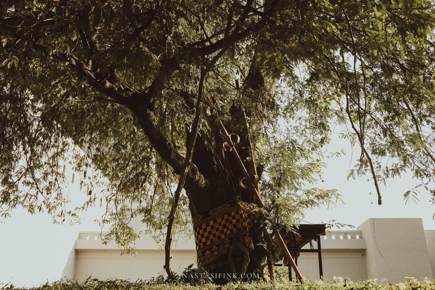 The black-and-white checkered cloth in Bali (poleng) marks a sacred place. Black and white are equals — neither one works without the other.