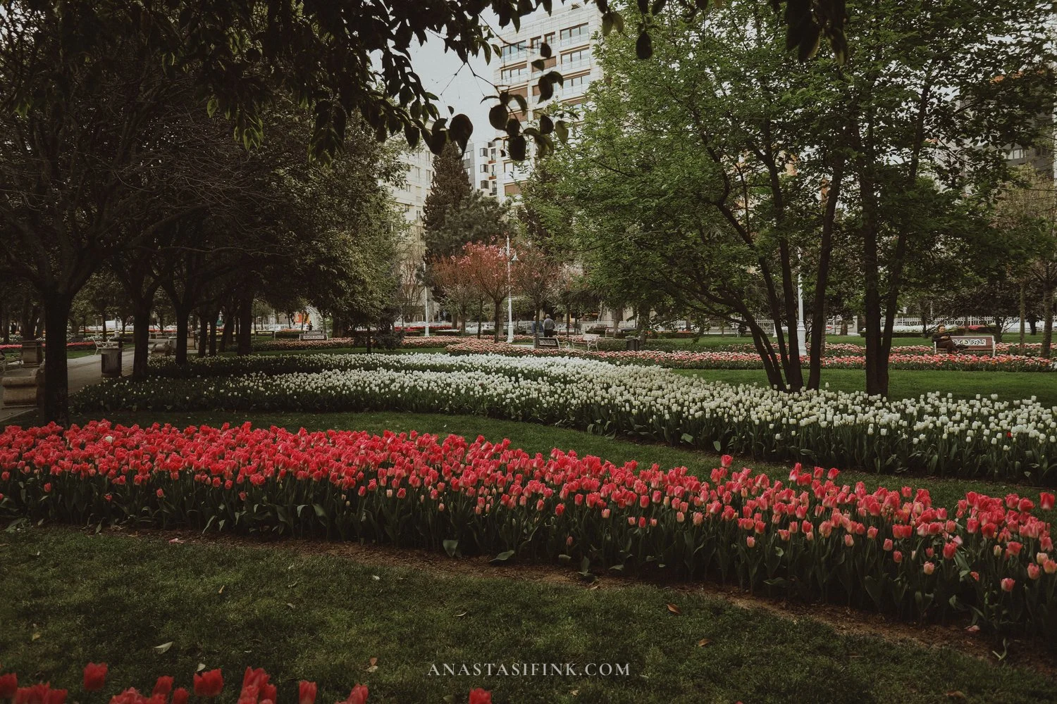 Besides the tulips, cherry blossoms, ornamental crabapples, and flowering shrubs were all going off at once. So much red that my eyes needed a moment to adjust.