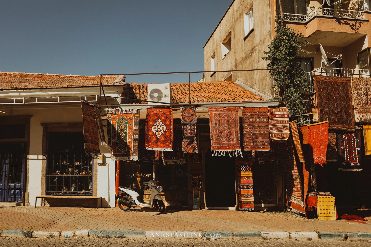 A própria cidade é um labirinto de ruas estreitas com casarões antigos de pedra. Muitos casarões são gregos, com janelas de baía características e venezianas de madeira. No térreo há lojas de tapetes. Tapetes estão por todo lado aqui: nas paredes, nos balcões, pendurados ao longo das calçadas como bandeiras.