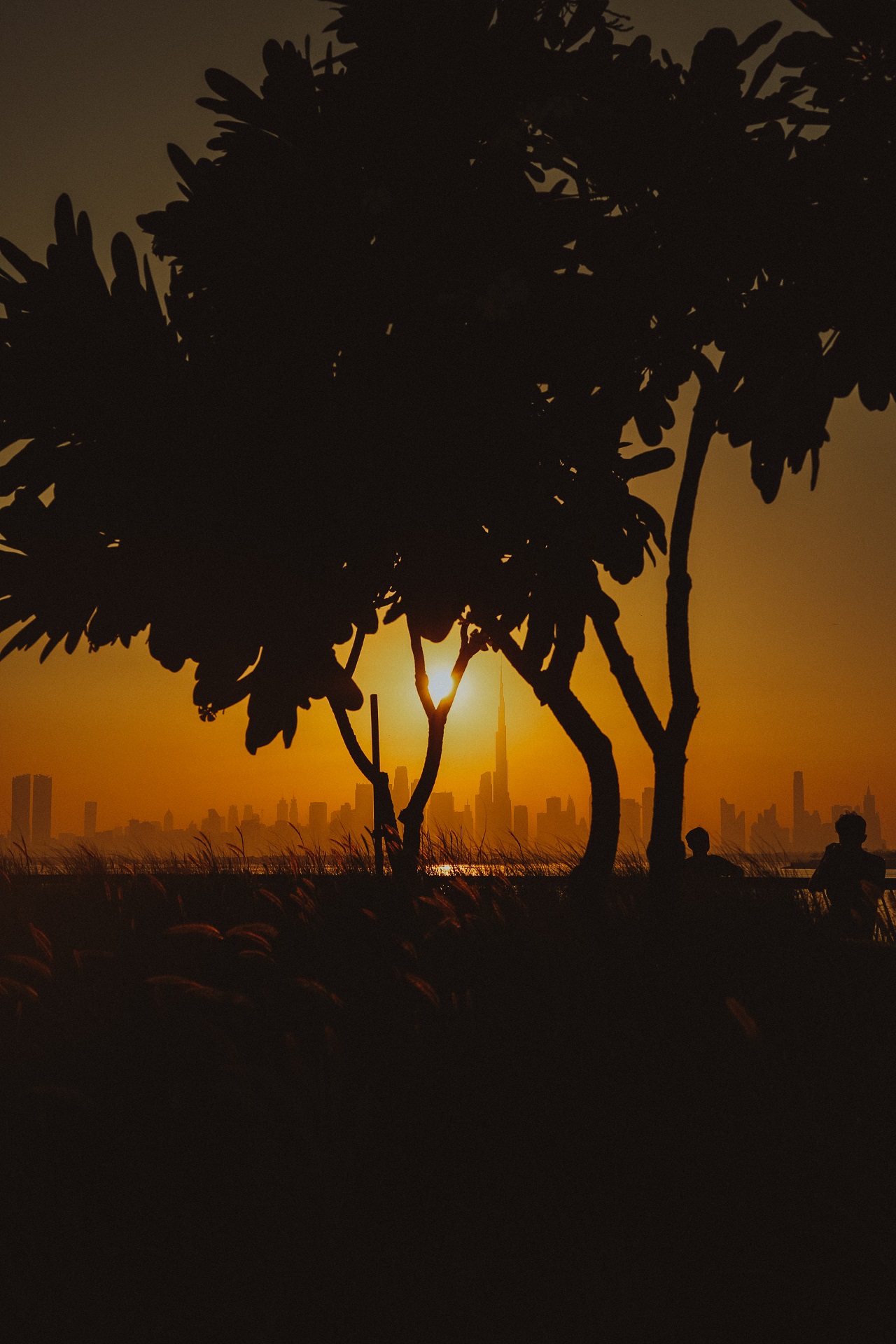 The sun sets right behind the downtown skyscrapers, creating stunning silhouettes of the Burj Khalifa and other high-rise buildings.